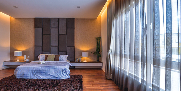 Warm Ambiences. Shades of brown and warm amber lighting create an earthy and soothing ambience in this master suite.