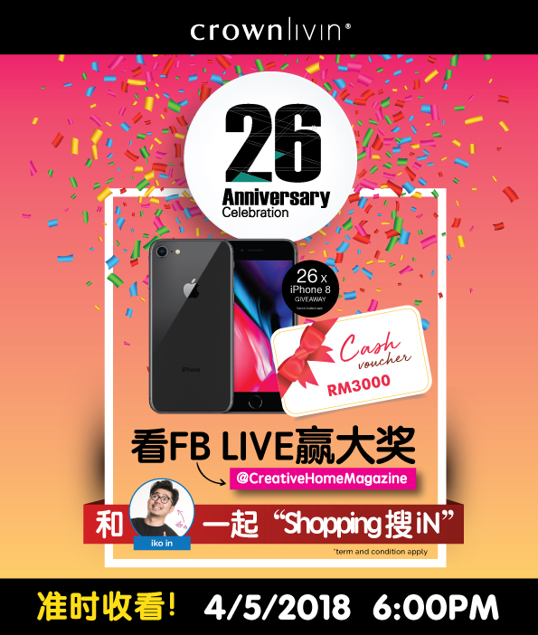 就在这周五 (4/5/2018),傍晚6:00pm, 在 @Creativehomemagazine 官方面子书上,以直播的方式为 Crownlivin 送出26 周年庆的26 份大礼。