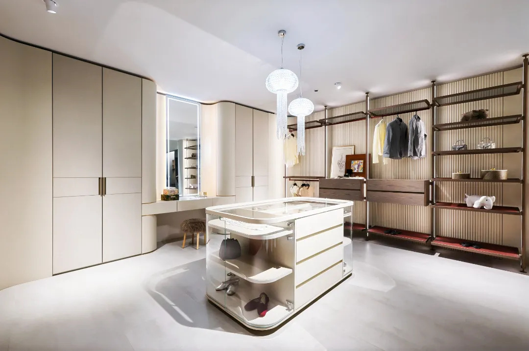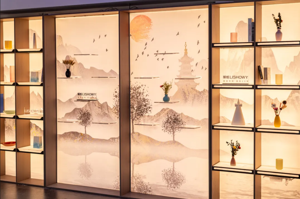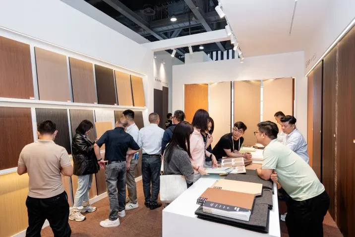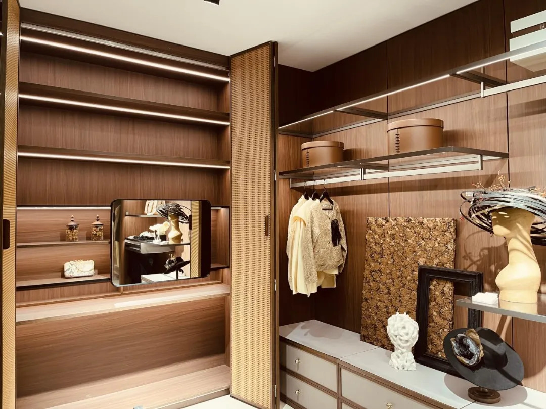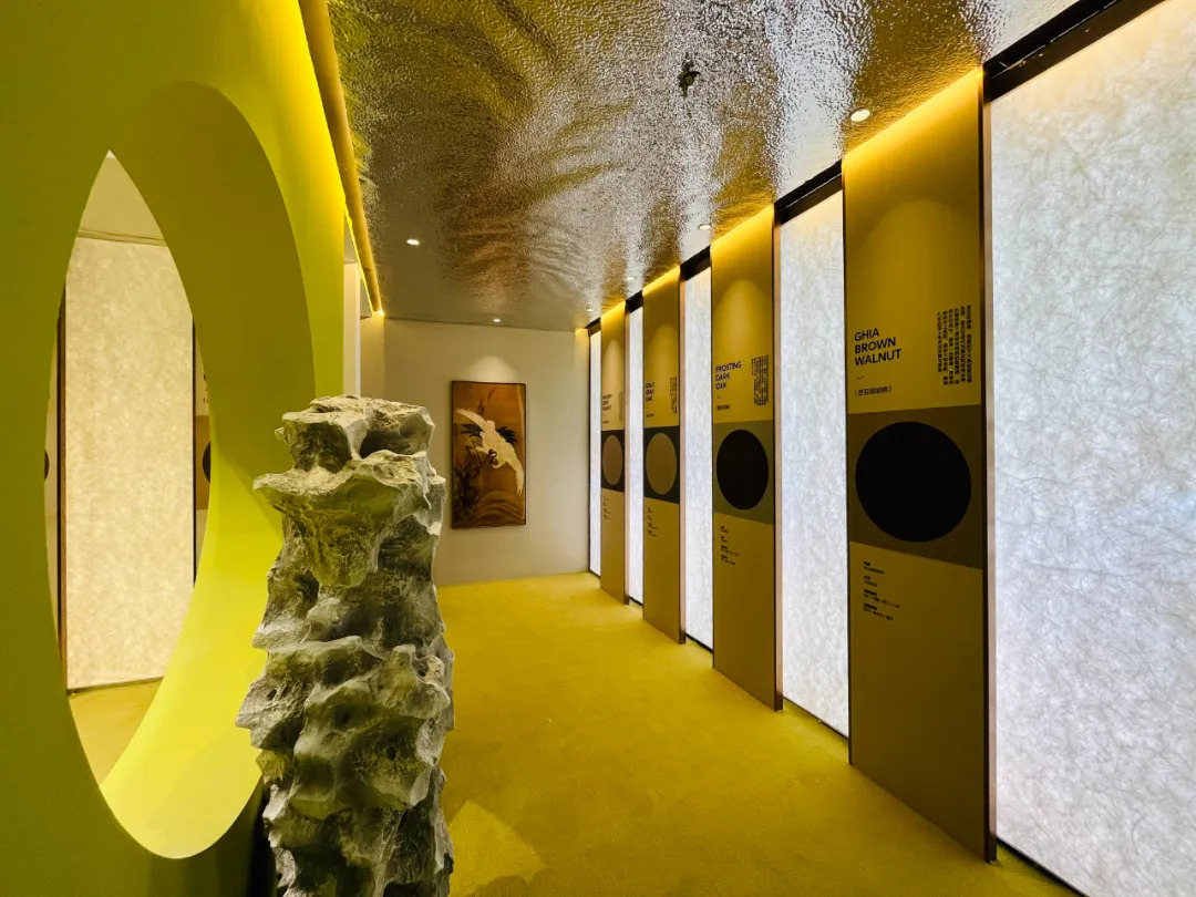 金牌家居「琉屿」「雅韵」系列,從宋代文人雅士的生活哲學汲取靈感,透過流暢線條與天然材質的精妙交錯,將千年雅致重塑於現代居家空間;尚品宅配的「沉香」系列同樣成為打卡熱點:以胡桃木為基調,融入骨骼門與藤編細節,並採用絲印玻璃工藝,讓材質與光影在門牆間交相輝映,將古典奢華與現代功能完美契合;晨晖的「萬花筒」系列則以榫卯結構和多元紋理,將敦煌壁畫與數位印刷相融,喚醒千年的文化記憶;森林鸽則以「雅宋·曉山青」高定精板主題展,將宋代美學與東方五行哲學結合瑞典 NCS 全球色彩趨勢,呈現跨文化與科技融合的家居藝術盛宴;麗炫照明則以「材質×光色×尺寸×圖案」的定制化設計語彙,推出發光背板、石材與 U 形層板等匠心之作,讓光不僅是照明工具,更成為提升空間美學的核心元素。