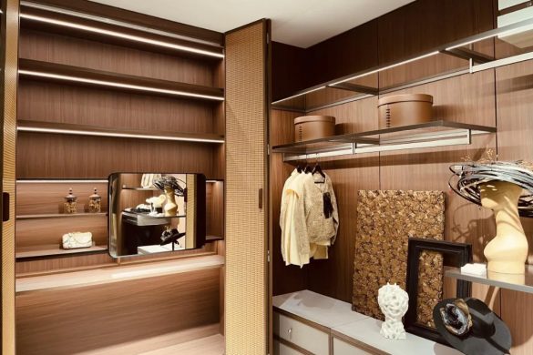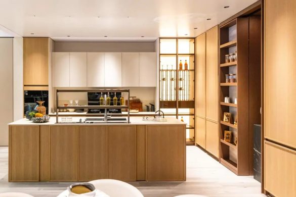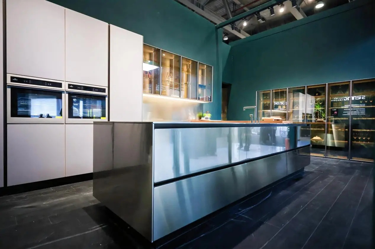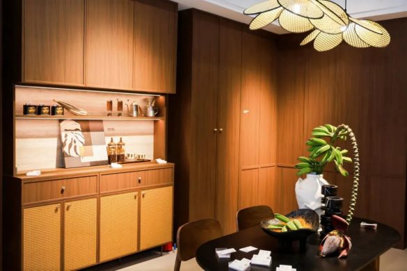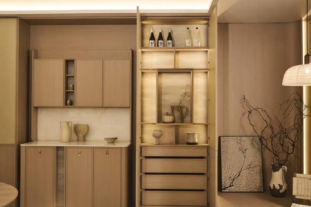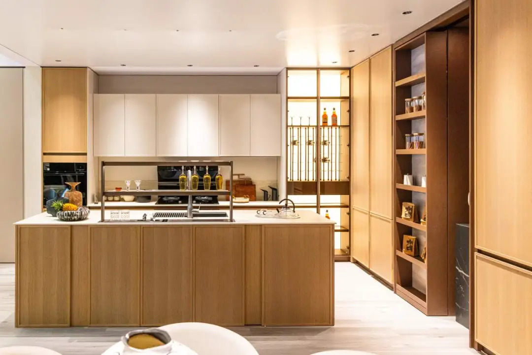 金牌家居「琉屿」「雅韵」系列,從宋代文人雅士的生活哲學汲取靈感,透過流暢線條與天然材質的精妙交錯,將千年雅致重塑於現代居家空間;尚品宅配的「沉香」系列同樣成為打卡熱點:以胡桃木為基調,融入骨骼門與藤編細節,並採用絲印玻璃工藝,讓材質與光影在門牆間交相輝映,將古典奢華與現代功能完美契合;晨晖的「萬花筒」系列則以榫卯結構和多元紋理,將敦煌壁畫與數位印刷相融,喚醒千年的文化記憶;森林鸽則以「雅宋·曉山青」高定精板主題展,將宋代美學與東方五行哲學結合瑞典 NCS 全球色彩趨勢,呈現跨文化與科技融合的家居藝術盛宴;麗炫照明則以「材質×光色×尺寸×圖案」的定制化設計語彙,推出發光背板、石材與 U 形層板等匠心之作,讓光不僅是照明工具,更成為提升空間美學的核心元素。