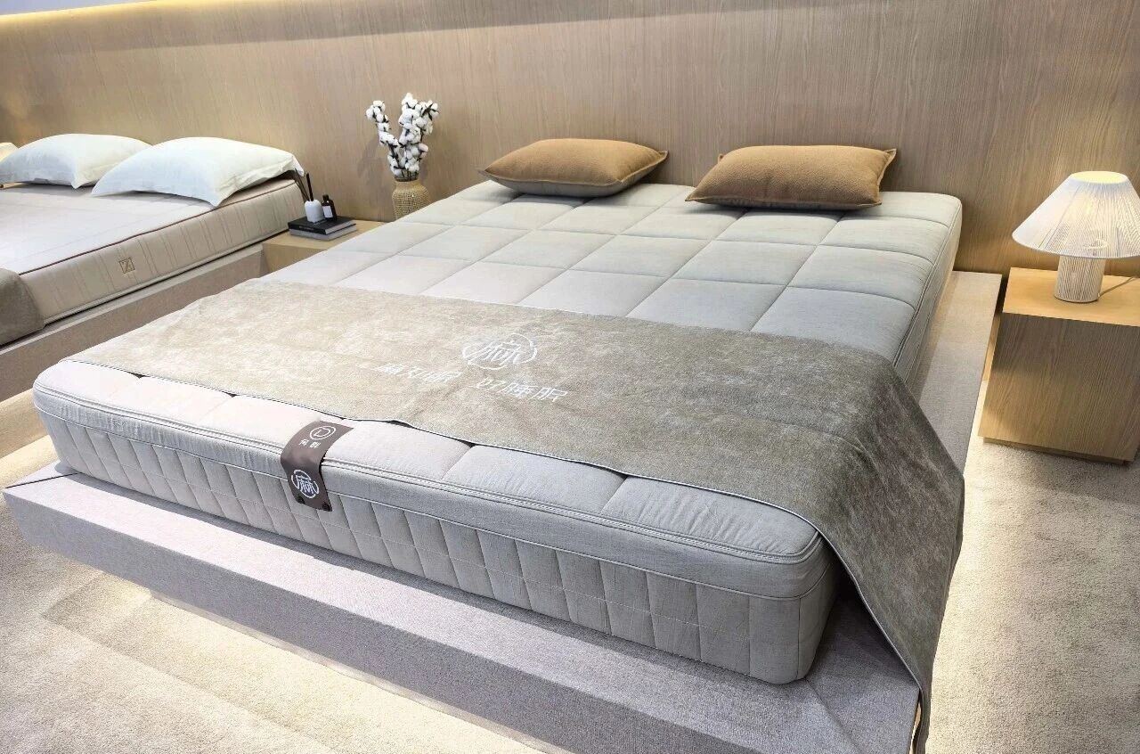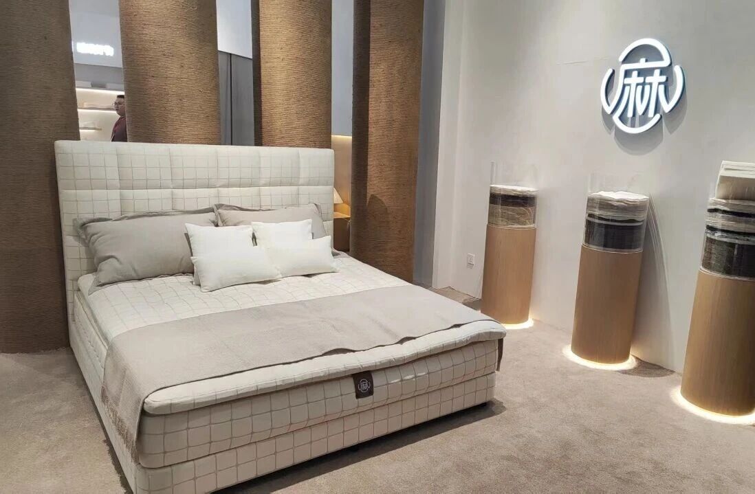 展會中可以看到,綠色材料不再只是替代選項,逐漸成為設計與製造的出發點。像朗樂福(LONG LIFE BASICS)推出的無膠水手工床墊,以物理結構取代化學黏合,讓每一層天然材料之間維持穩定連結;大自然床墊以天然麻纖維為基礎,透過可拆結構與可調節設計,使睡眠體驗能隨個人需求進行細緻調整;恆林家居(HENGLIN)所研發的 Super Fiber 材質既擁有鴨絨般柔軟的雲端坐感,又具備可靠的承托力。