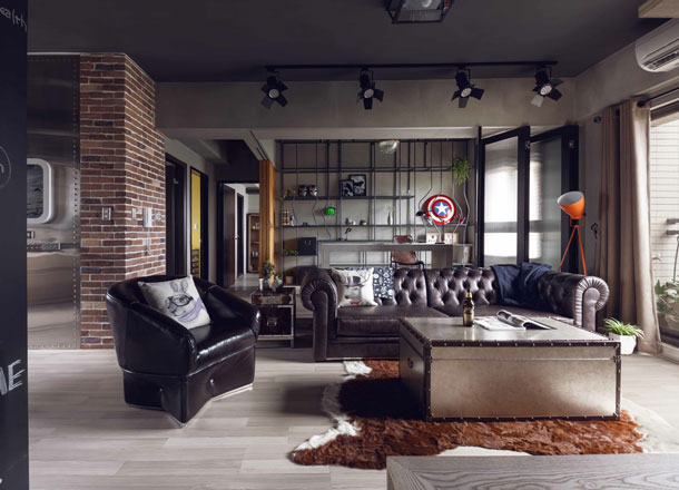 如果比较起亮色系,暗色系更是男性们的喜爱。上图的暗色系,加上线条简洁的收纳柜,让整体空间的工业风格再度展现。这样的颜色搭配,让人由衷男性单身公寓的感觉。你也可以在空间中加上你喜爱的元素,来提升空间的个人风格。