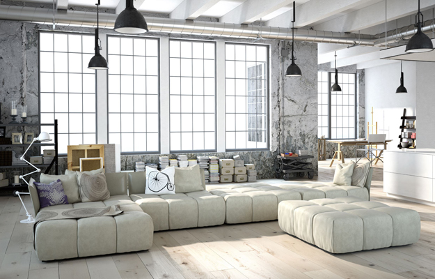 黑色系,是工业风格的唯一选择吗?当然不是。就如以上的途中,你可看到空间有明亮的采光,却搭配着一盏盏黑色的灯饰,让整体空间依然是同个风格。另外,特别的是由方形所组成的沙发,米白色,更加衬托出空间的靓丽和突出。