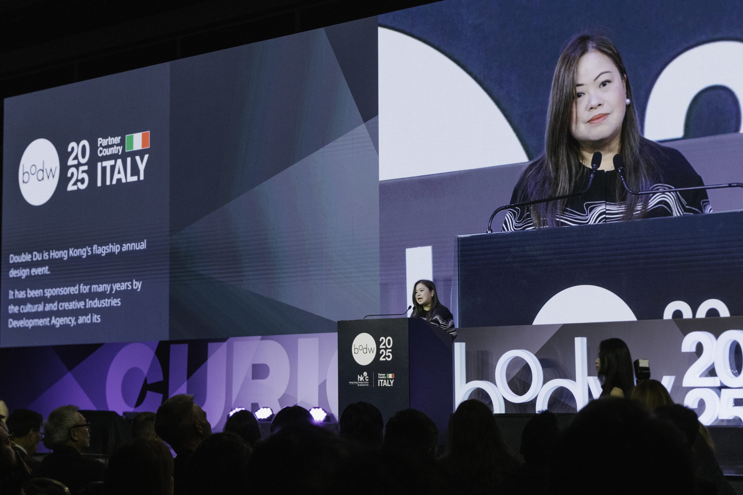 香港特別行政區政府文化體育及旅遊局局長羅淑佩女士,JP 致辭時表示:「在設計營商周峰會中,來自不同設計領域的大師將引領我們重新探索卓越設計如何提升生活質素,並共同構思設計如何助力塑造更美好的未來。今年,我們榮幸再度迎來意大利作為伙伴國家。基於 2007 年及 2017 年的成功合作基礎,加上 2025 年適逢中華人民共和國與意大利建交 55 周年,此次於設計營商周再度相聚,可謂恰逢其時、別具意義,亦再次印證香港作為東西方國際文化交流中心的角色。」