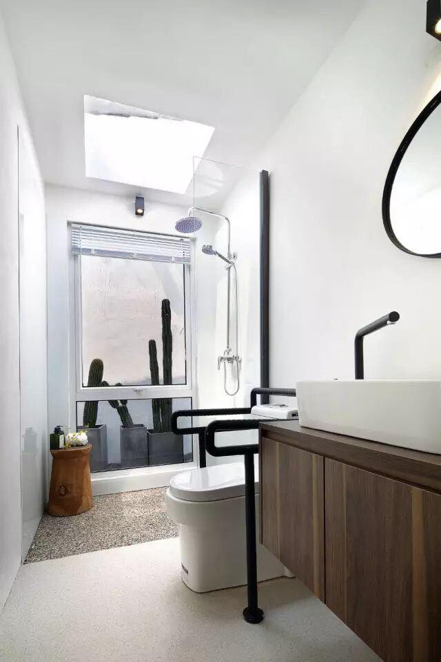 习惯居住于老房子的年长者,喜爱透风的开放式设计。因此,贴心的设计师在卫生间中显而易见。他在淋雨空间设计一个 “头天窗”,让暖和的阳光撒入室内,让人不感潮湿感。