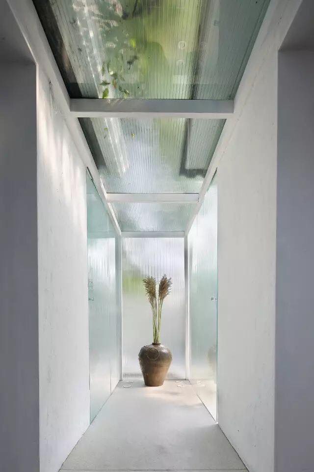 户外的仙人掌与绿叶,在这片白茫茫的墙中,显得更加绿意充斥。