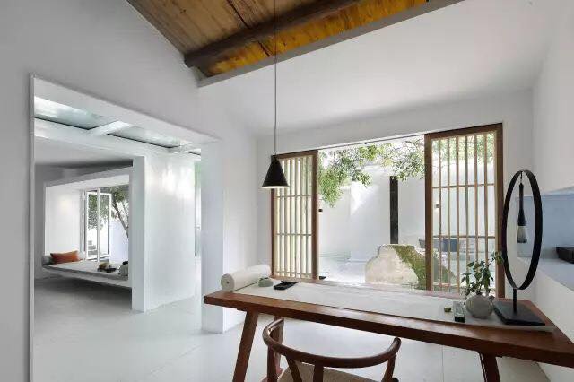 这样一个古色古香的艺术空间,选择的是一贯的木质书桌,加上毛笔的悬挂,让空间充斥着艺术感。放眼望去,即可脱开木门,和户外的芬多精打招呼,让人舒心。