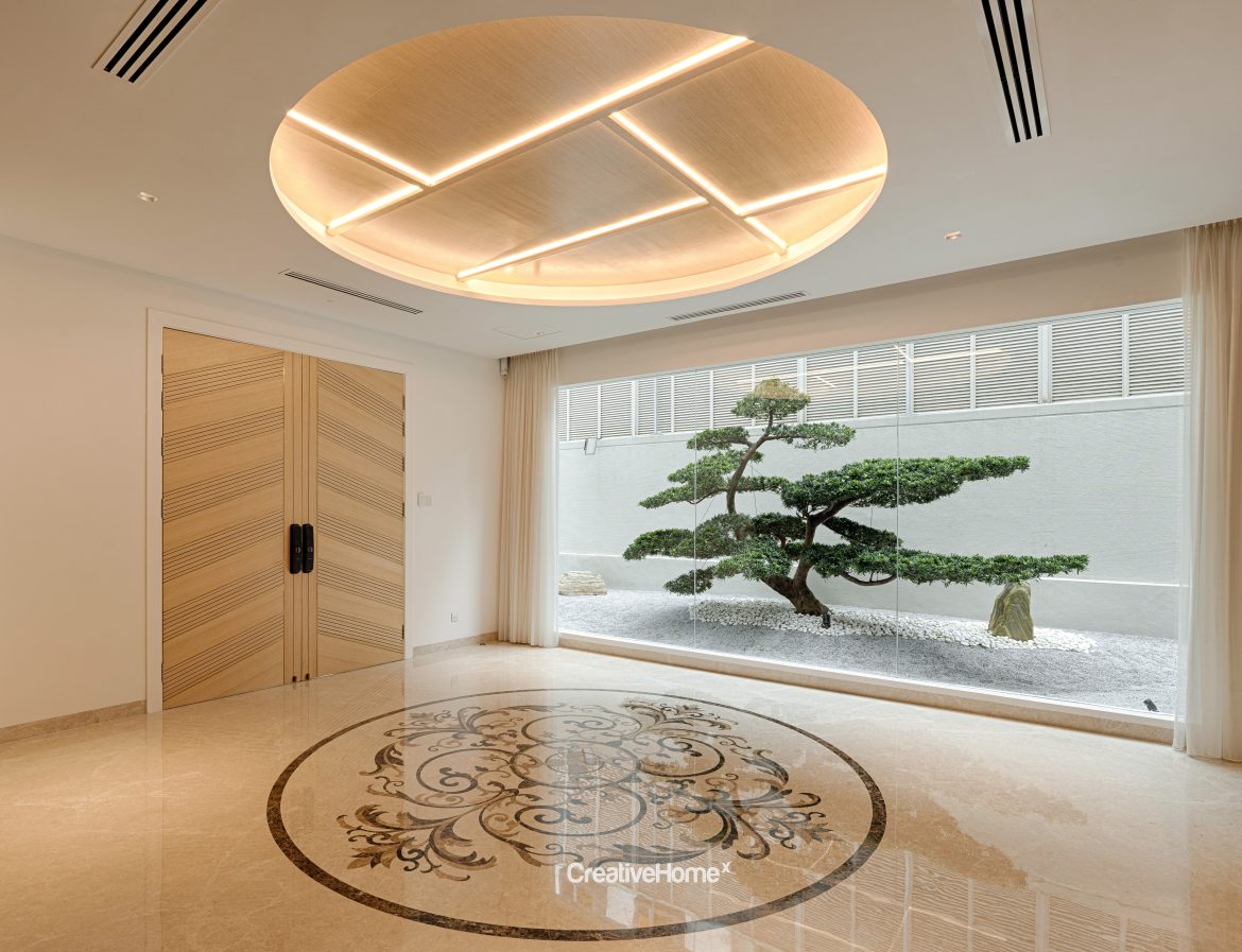 基於風水考量,並結合迎賓視覺呈現,玄關地坪特別採用三種石材拼貼成獨特圖騰,地面拼花工藝非常考驗師傅功力,缺一塊或錯位將不成圖形,最終成功將這地坪昇華為空間中的藝術亮點,圓形元素與吊頂遙相呼應,將燈帶嵌入木條内,清楚可見木紋肌理,藉由打光豐富視覺效果,無形中流露入門的大氣印象。