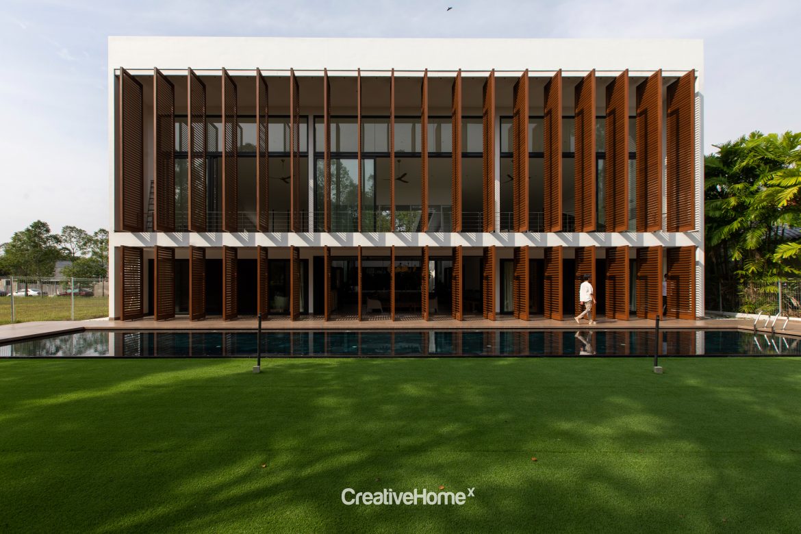 本案坐落於柔佛,屋院後方可見樹影婆娑、池塘倒映著橋梁,這一自然景序描繪嵗月靜好的畫面,建築師 Hao Wang 對在地環境的仔細勘察,結合專業的設計底蘊與創意能力,以素白矩形量體形塑建築外觀,援引仿木紋肌理的鋁百葉窗構築房屋立面,可旋轉的特質為外部帶來豐富多樣的立體視感,能夠自由調節光線、開展與關閉,引入自然風與日光隨意游走於室,形成一室窗明几净與朗闊清透感。