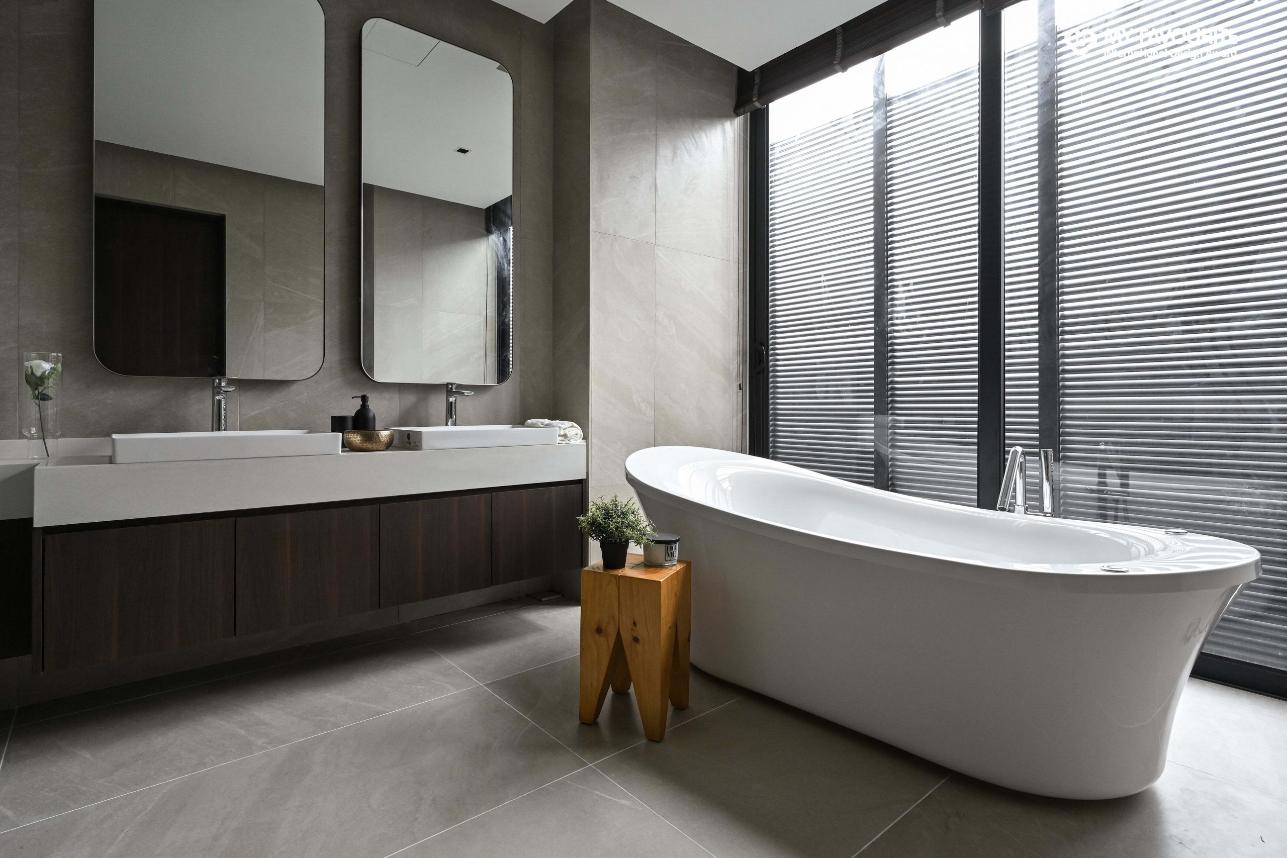 來到衛浴空間,從牆面到地面,大地色系的溫潤大磚作為空間的主體肌理,創造出視覺的連貫性;線條流暢的純白獨立浴缸斜倚窗邊,引進充沛的自然光,浴缸旁導入了原木矮凳,注入一抹樸實氣息,是空間中畫龍點睛的暖調點綴。