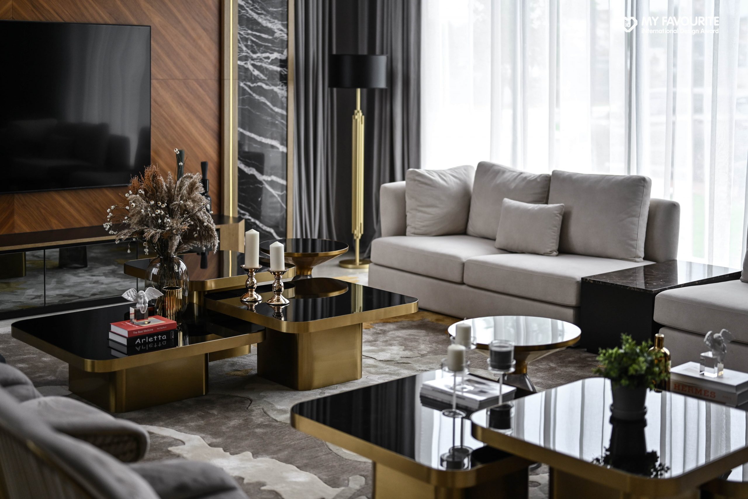 挑高雙層客廳以木紋與黑白大理石的電視牆構成主軸,藉由木牆面延展出向上的視覺韻律,結合黑色大理石收邊,讓質感更沉穩。設計師以圓弧家具、金屬細節與紋理地毯柔化整體氛圍。茶几以黑玻鏡與金色做結合,反射光影層次,呼應天花圓形水晶吊燈的流動感;絲絨單椅與淺灰沙發的搭配,平衡了材質冷暖,成為日常的舒適質地。