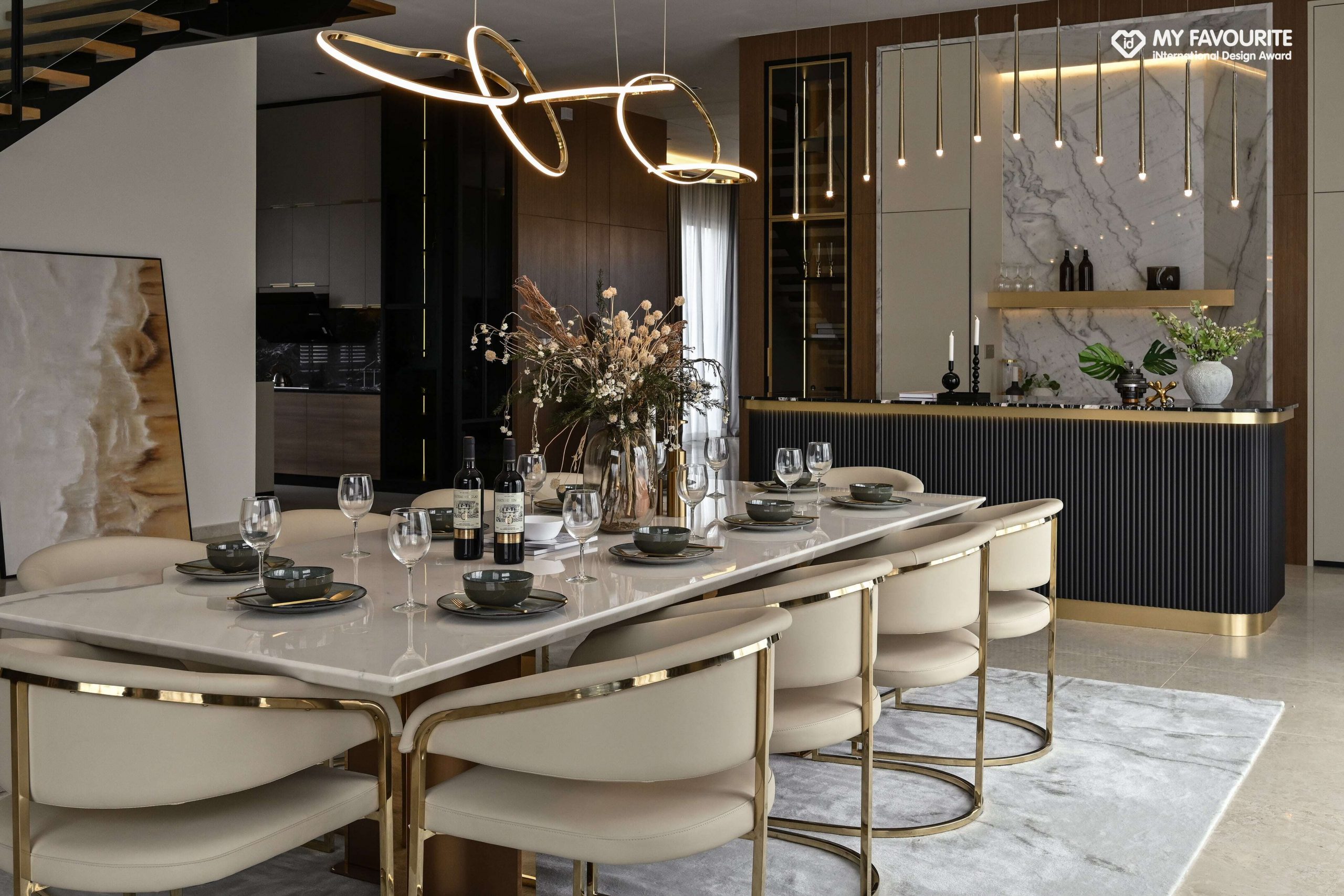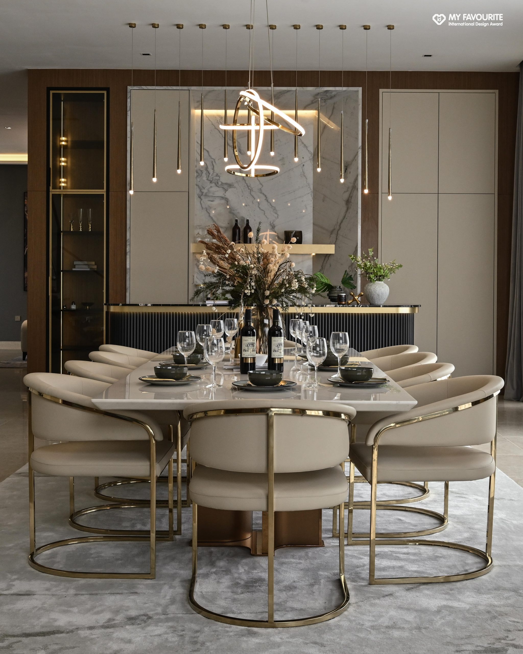 走進餐廳,餐桌以大理石的天然紋理為底,成為串聯家人與賓客情感的核心,環繞其側的弧形餐椅,以金屬光澤勾勒細節,讓餐敘不只是日常,而是一場關於質感的儀式。
