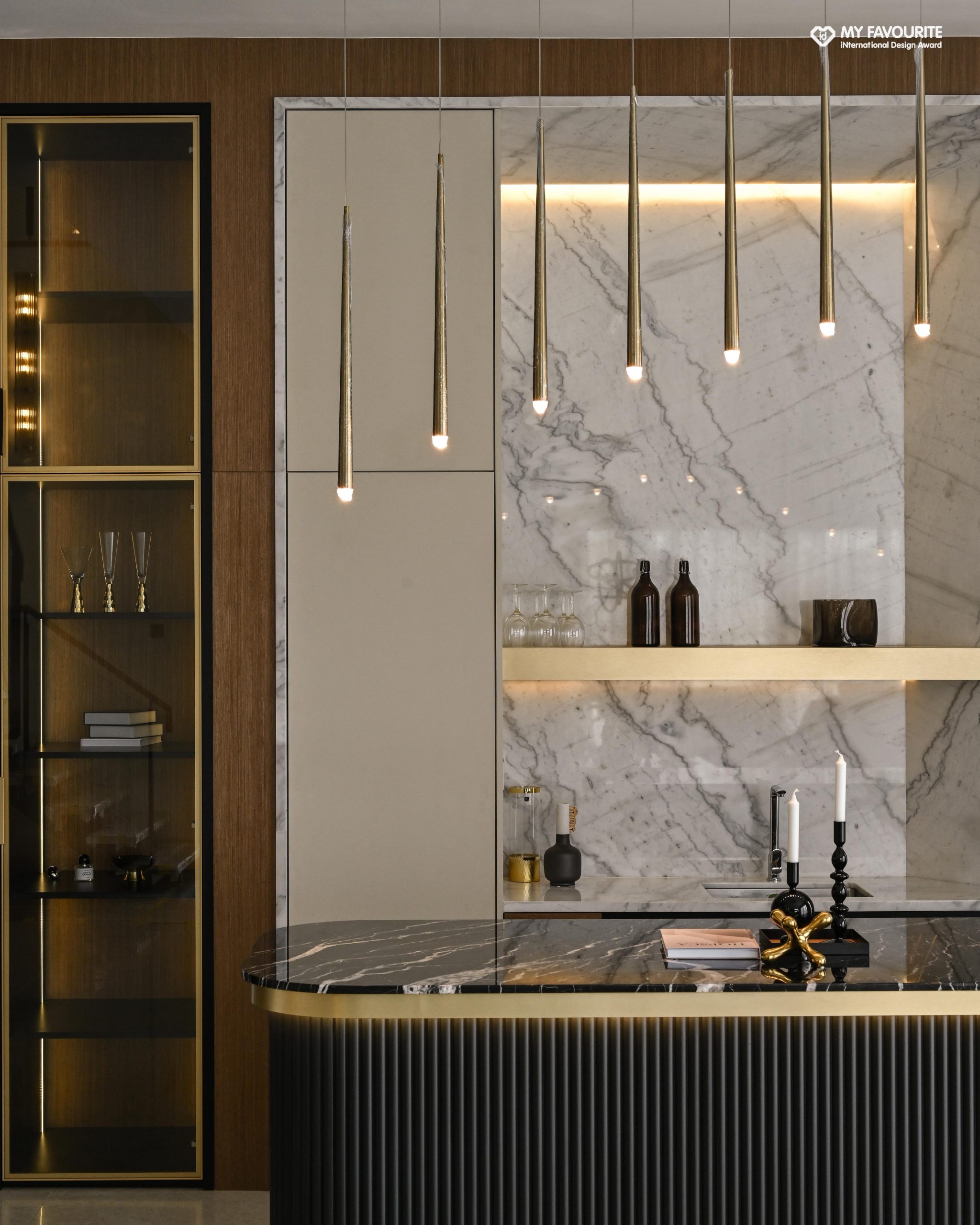 吧檯空間透過斜面語彙打破常規的垂直牆面結構,讓視覺在細膩轉折間展開。背牆上方與右側的斜角設計,巧妙導引光線流動,燈帶的柔光沿著大理石紋理緩緩擴散,營造出層次豐富的明暗表情;黑金相間的中島檯面採用花崗岩打造,並以俐落線條收邊,搭配垂直金屬吊燈,詮釋現代豪宅空間的沉穩奢雅。