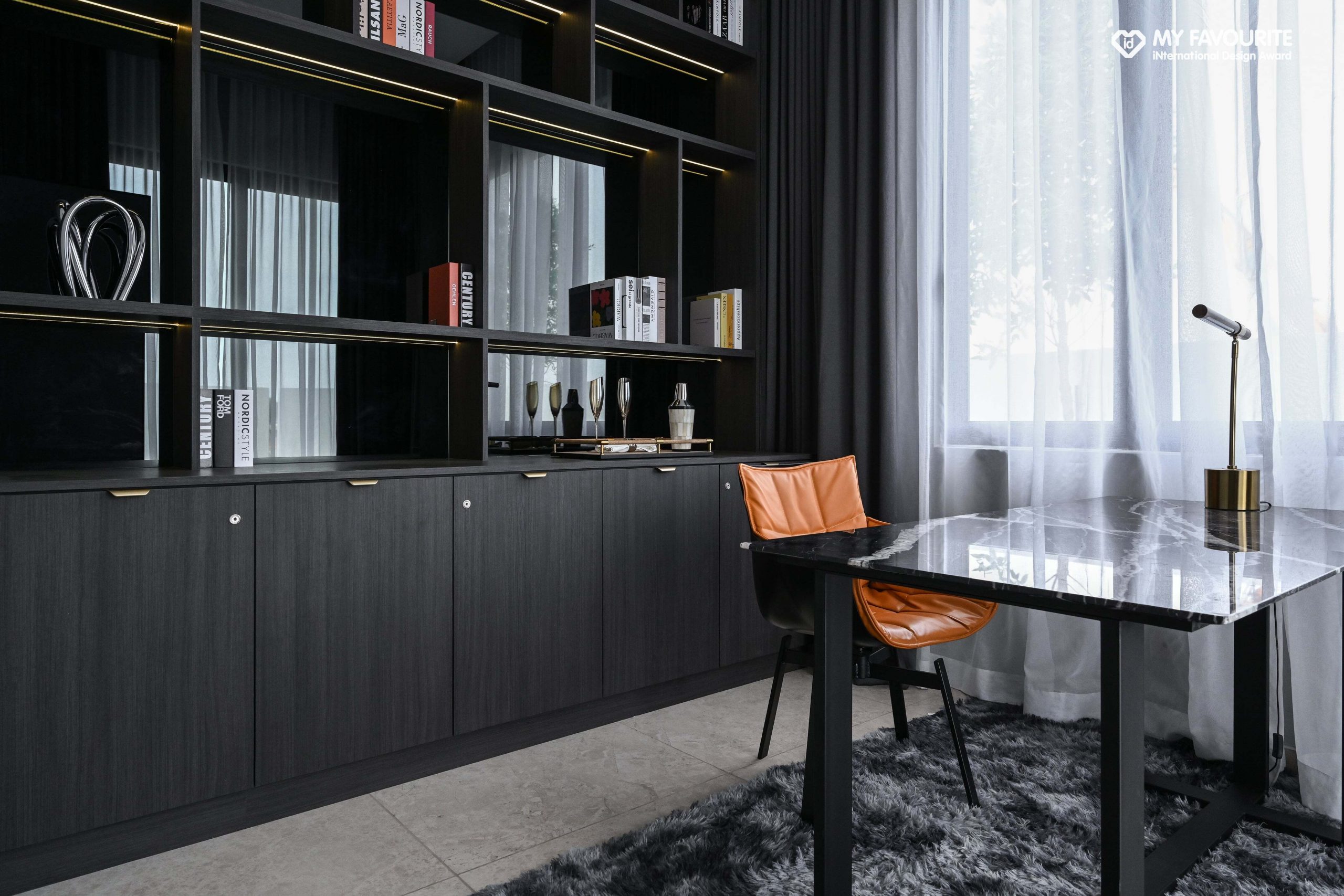 以一整面頂天立地的深色木紋櫃體作為書房視覺核心,開放式層架背牆巧妙引入鏡面,將前方空間景深瞬間拉闊,層架內嵌纖細光帶,暖黃光潤自然打破深色量體的沉重感;辦公椅選用溫潤的愛馬仕橘皮革單椅,瞬間為沉穩的空間注入活力,成為書房最引人注目的視覺焦點。