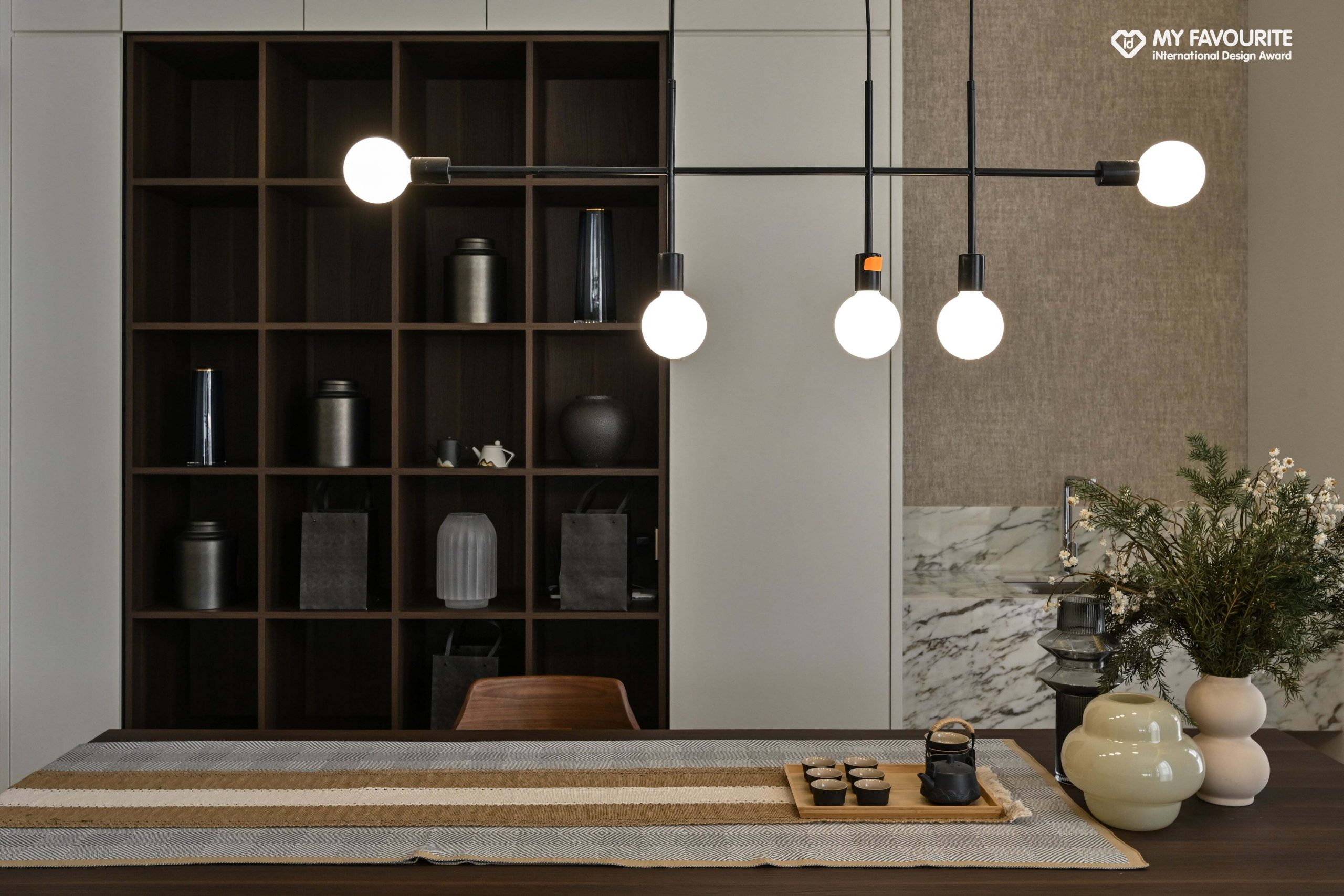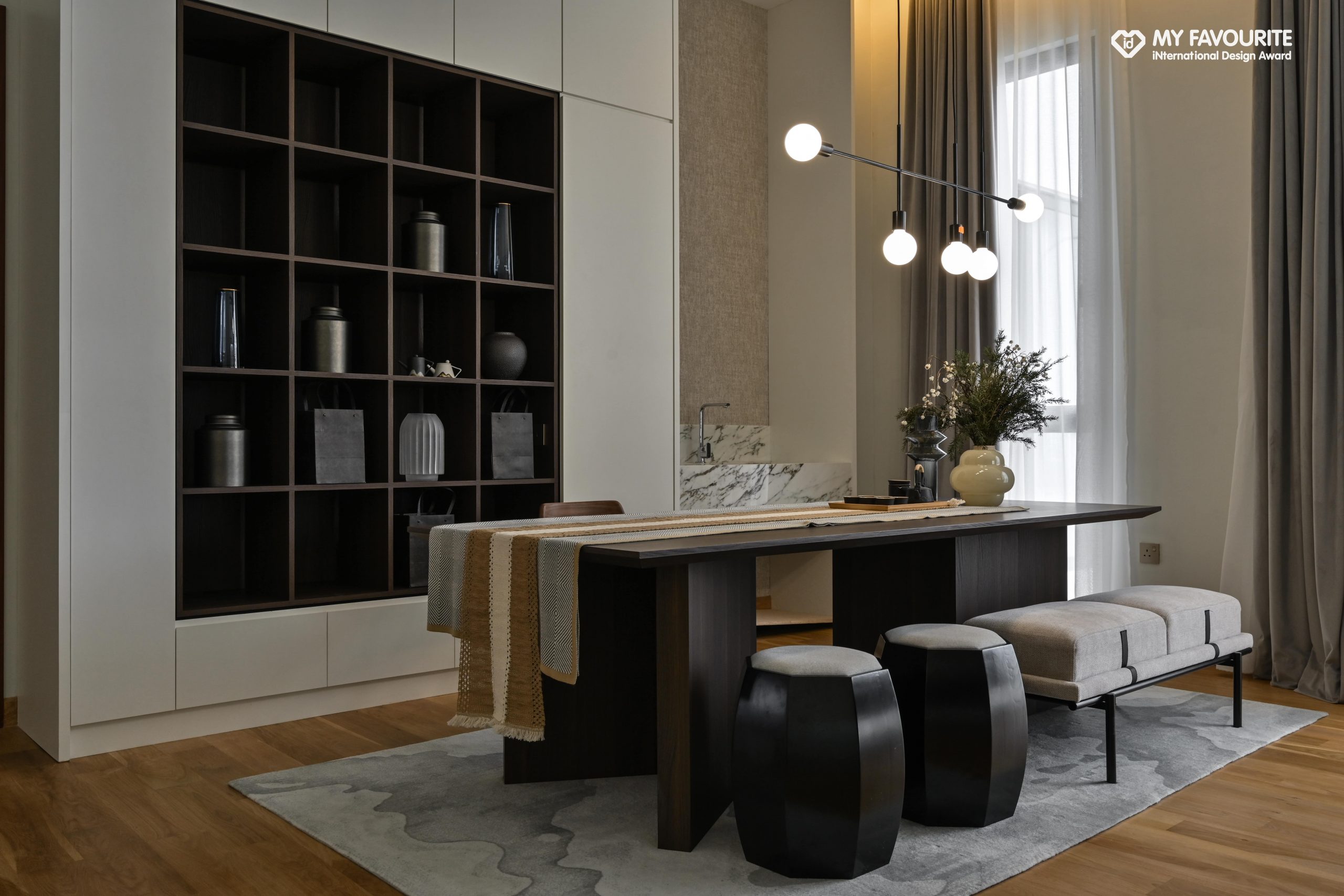 踏入次起居空間,設計師特別規劃出一方專屬茶空間,以深色木質桌體與背牆木格櫃為主調,擺件的留白比例拿捏得宜。最妙的是,設計師在一旁整合了小型洗滌檯,強化使用機能,讓茶空間不再只是休閒角落,而是連結社交、品茗與生活美學的日常場景。