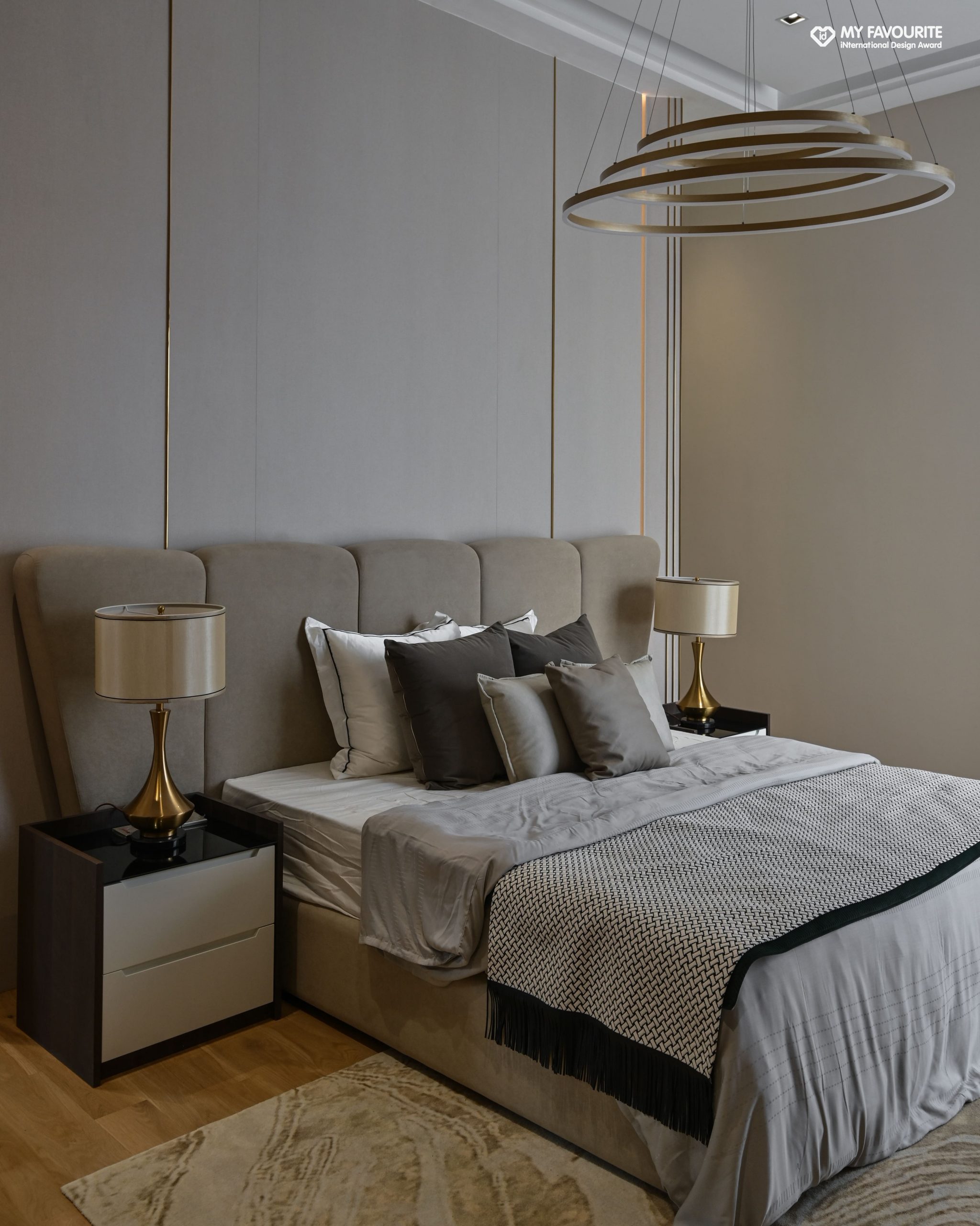 主臥床頭軟包以飽滿絨面皮革精緻包覆,採用蝴蝶狀分格設計,柔和的線條構築出一個療癒身心的休憩領域,增添舒適優雅的氛圍,床頭背牆嵌入極細的鍍鈦金屬飾條,創造出視覺的向上延伸感。