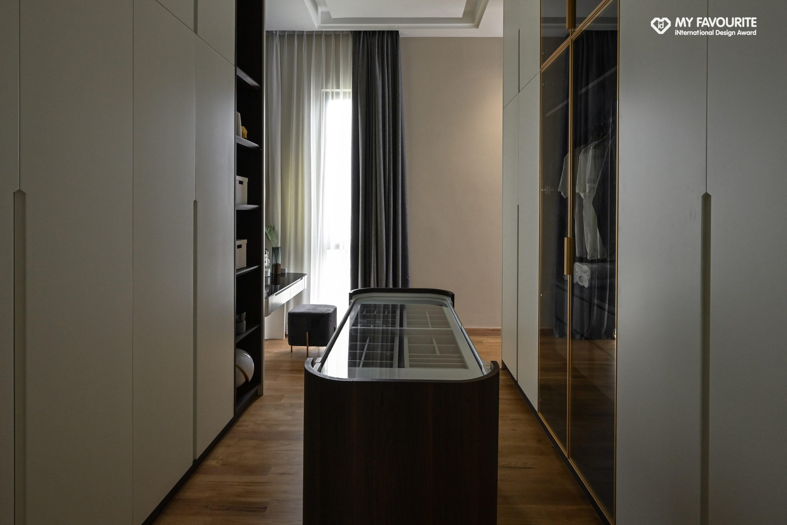 來到步入式衣帽間,兩側頂天立地的淺色極簡櫃體,巧妙穿插了鍍金邊框的深色玻璃展示櫃,讓服飾在光影中成為焦點,居中設有弧形中島櫃,將內層收納的珠寶與配件一覽無遺,極大地提升了取物的便捷性。