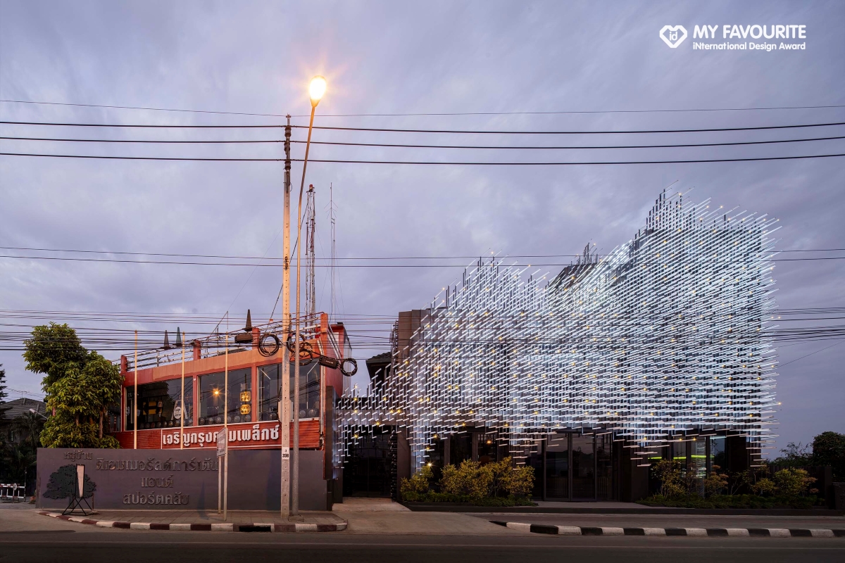 外立面由數萬鋁條組成的帷幕,白天如蒲公英般隨風搖曳,入夜後化為螢火蟲光點,巧妙呼應 Ko Kret 島生態,這些鋁片能夠過濾噪音、調控日照,更將建築、室內、景觀與家具整合為一體化語彙,使鋁材從工業製品,昇華為空間敘事的媒介。