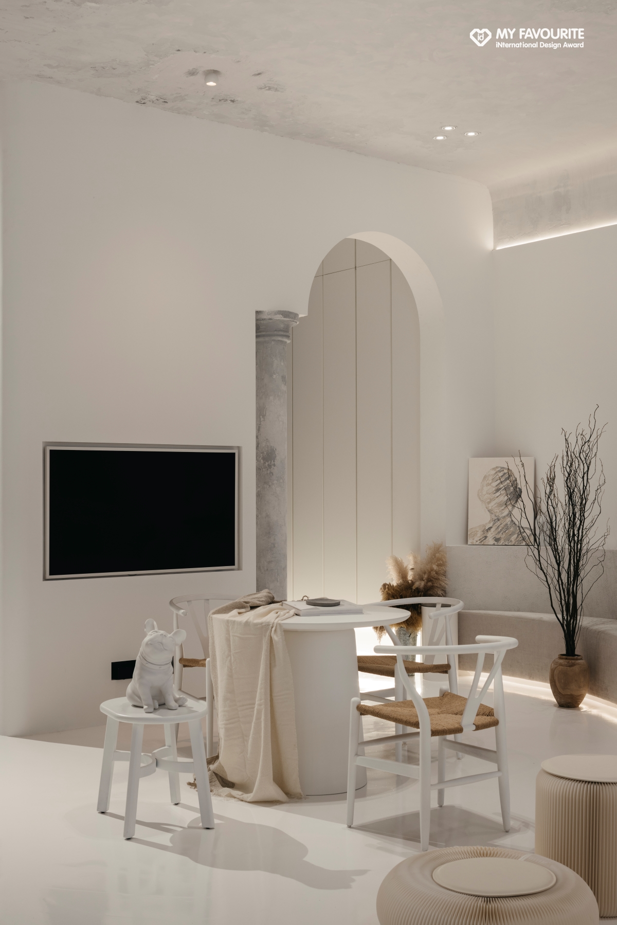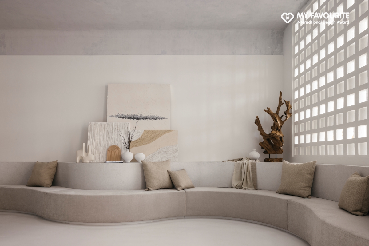 設計團隊以侘寂美學融合極簡語彙,設計重心放在自然質感與空間節奏的細膩鋪陳,透過柔和曲線形塑天花與牆面,營造有機、溫潤的感官體驗。
