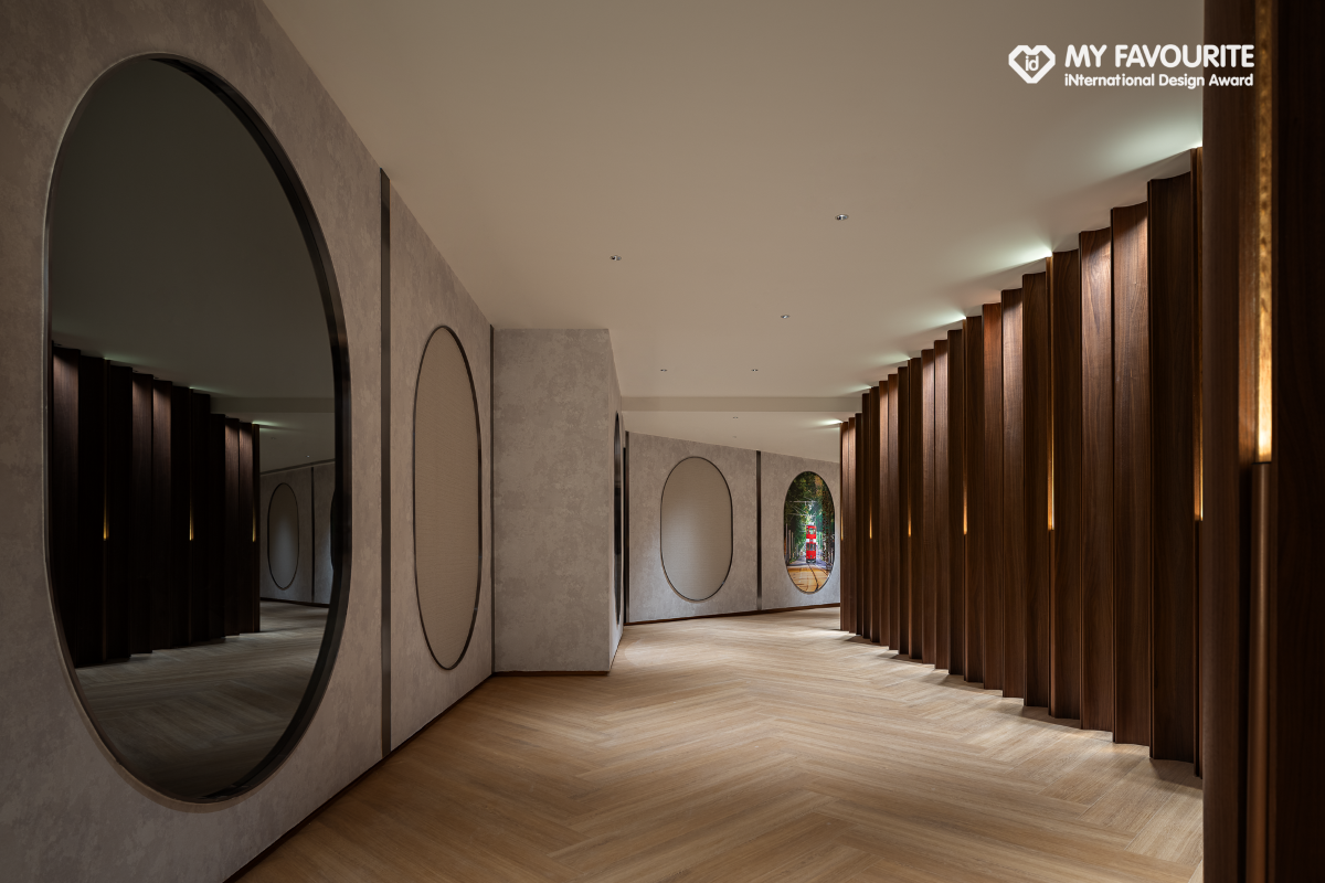入口處以層層堆疊的拱門與引導式燈光營造尊榮感,搭配沉穩苔綠色作爲主視覺,延續品牌主題色並形塑自然有機的氛圍。走廊以天然木皮包覆機能動線,強化「城市綠洲」的設計概念,引導訪客流暢抵達樣品屋,消弭冗餘停留;空間最終進入開放式圓形私人諮詢區,以東西合璧的材質語彙,混搭石材、金屬與織品,共同營造奢華與安全感;鄰近的模型展示區,巧妙運用鏡面與圓頂設計,創造視覺延伸與挑高感,整體參觀體驗充滿空間張力與記憶點。