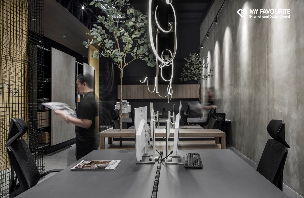 開放式工作桌嵌入隱藏式線路收納系統,確保科技設備管線不干擾視覺純粹性;機能配置上整合開放式工作桌、討論區、厨房、樣品展示牆等,靈活對應彈性辦公與團隊協作的多元需求。