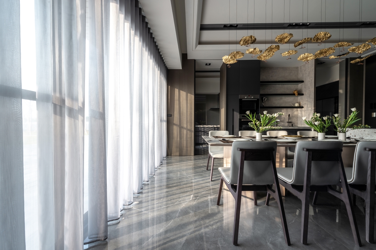 以建物中軸的玄關與梯廳為核心,精準劃分左右對稱的公私領域,左側客餐廳、交誼廳與客房滿足聚會待客需求,右側主次臥與書房確保隱私。一樓多功能次臥更整合掀床、隱藏式滑桌及臥榻,靈活切換通鋪休憩與觀景茶席模式,實現一室多用的極致機能,呼應屋主退休宅需兼顧家族聚會與日常起居的雙重需求。