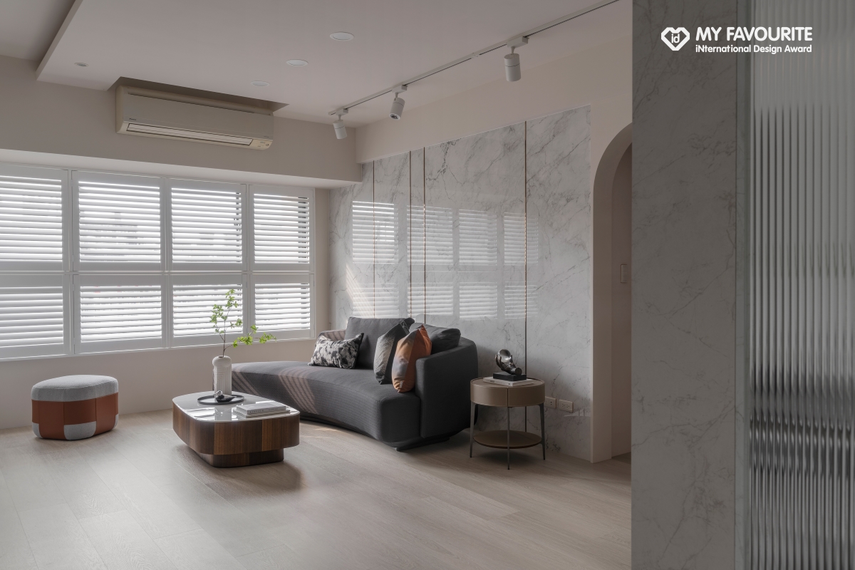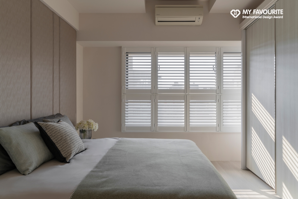 以清新簡約為基調,透過淺色漆料修飾低矮樓高與粗壯梁柱,搭配米白與奶茶色系,釋放空間高度與視覺寬闊,為性格內斂、工作繁忙的屋主夫妻,營造歸家即放鬆的舒適氛圍。臨馬路的窗戶捨棄布簾,改以可調式百葉窗引入柔光,既解決西曬問題,亦讓室內隨日照角度,流動出豐富光影層次。