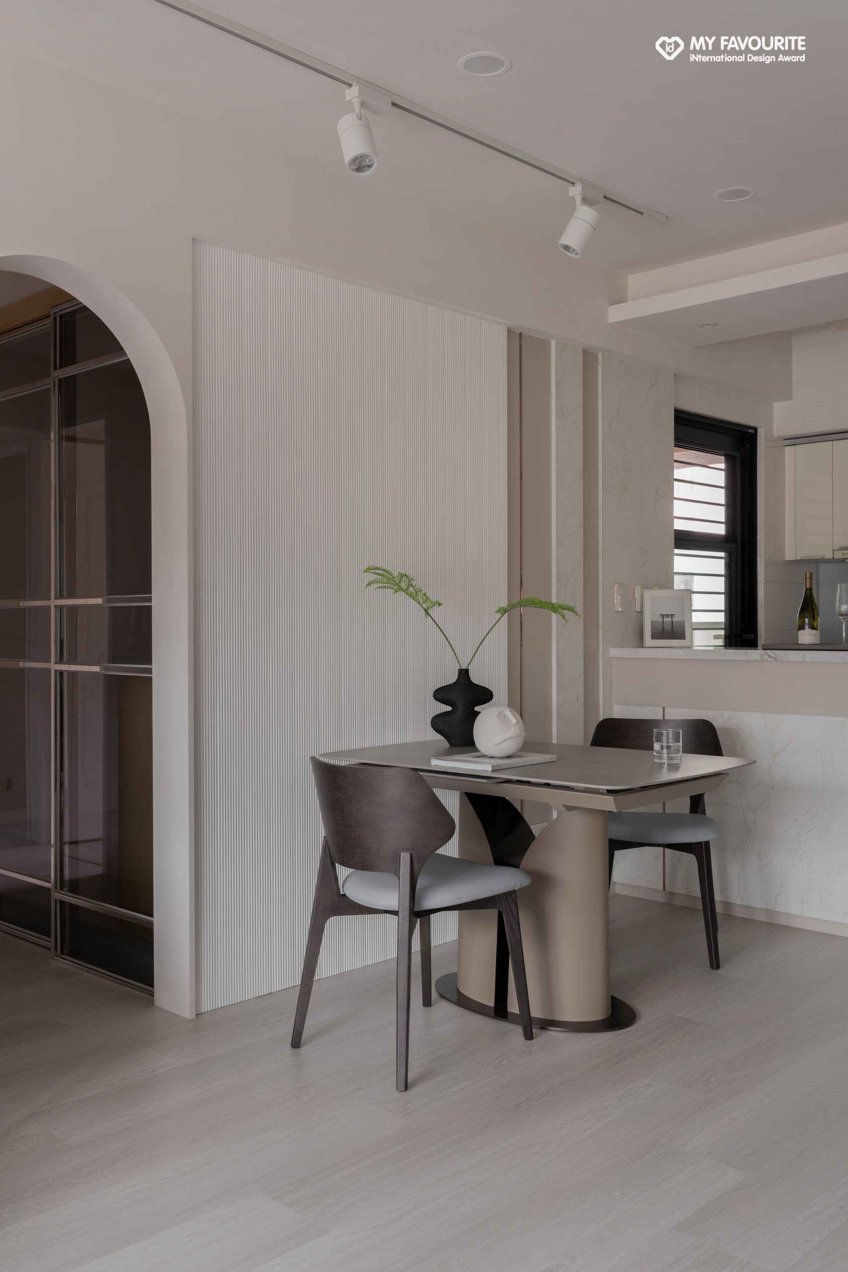 入口增設的弧形玻璃屏風與旋轉鞋櫃,兼顧隱私、通透性、收納量以及便利性;拱門廊道劃分公私領域,賦予動線儀式感卻不顯封閉。從玄關延伸至客廳與餐廚區的 PU 線板,搭配鍍鈦金屬與美耐板間接照明,藉直線分割視覺上延展樓高,創造雅致縱深。公領域以折疊餐桌、中島吧台靈活調配用餐規模,並巧妙避開開門見灶的風水忌諱。全室保留原始四房格局,減少固定家具,預留長輩客房與未來育兒的彈性需求。