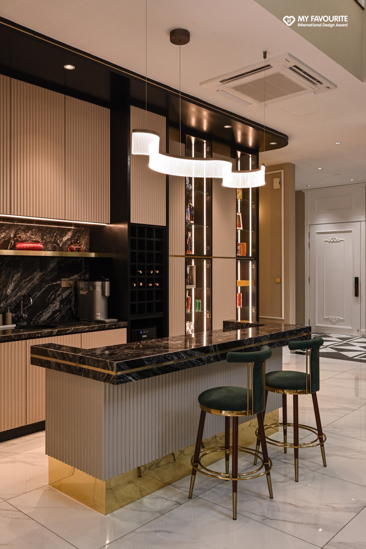 開放式吧檯底座鍍金鏡面處理,與墨綠絨布高腳椅的金屬色澤交相輝映,又巧妙呼應客廳墨綠沙發色調。設計團隊更以壓紋玻璃推拉門區隔廚房與洗衣區,既劃分機能場域,又維持視覺通透性;櫥櫃拉手、吊燈水晶配件皆採用金屬鍍金處理,恰如其分地提點貴氣,卻未淪為過度堆砌。