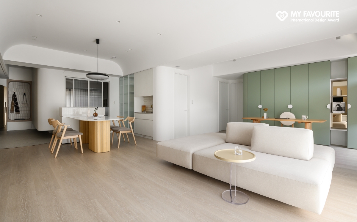 米棕暖調與淺綠點綴於素白基底,如土壤與樹影漫入天壁,構築出「漫步雲端」的清朗愜意,開放式客餐書房以「口字動線」破除單一路徑限制,可拆分三塊的雙向沙發、環繞中島與書桌,讓家人與賓客自在穿梭;轉角全數改為圓弧造型,搭配訂製圓角家具,兼顧孩童安全與視覺柔化。