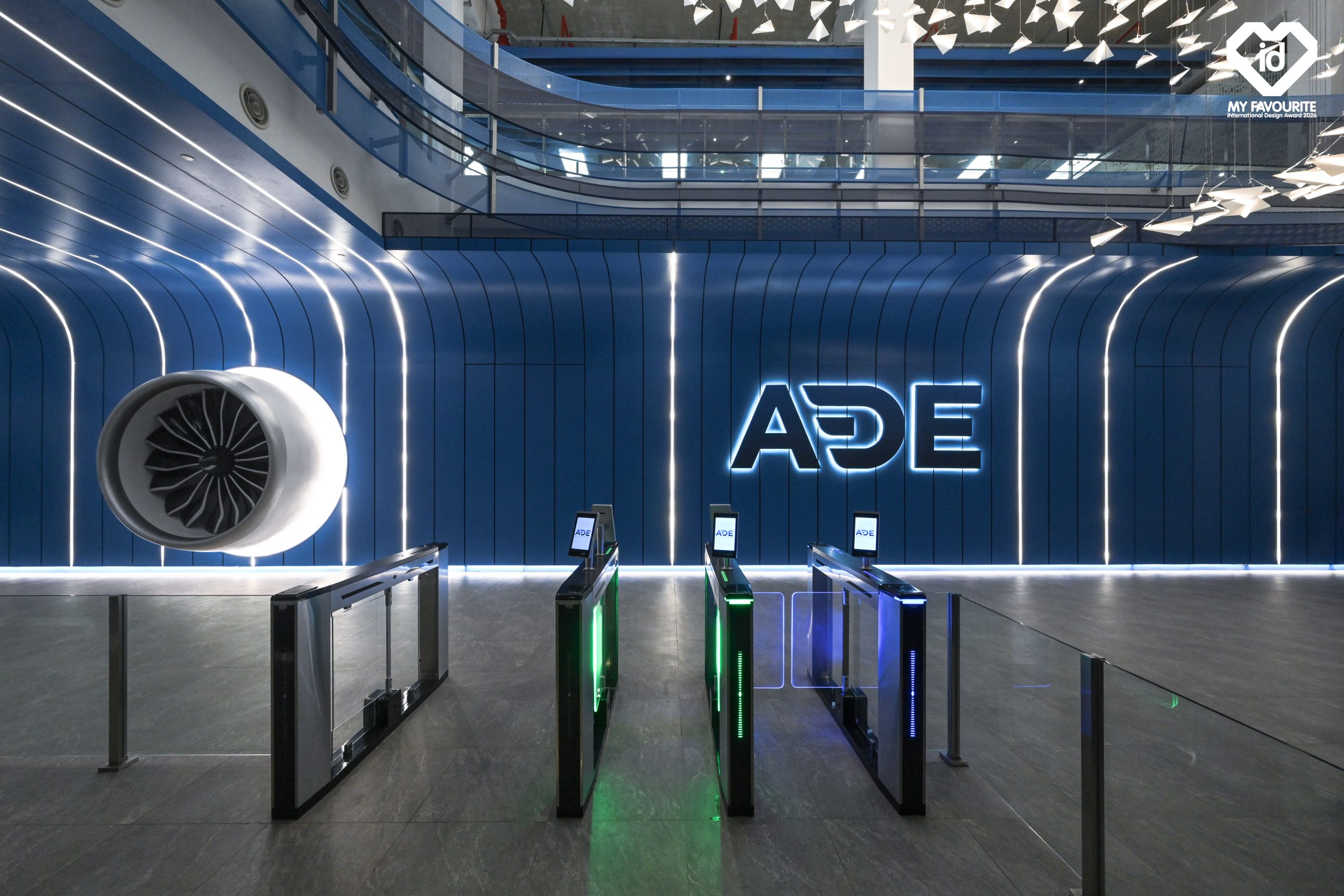 設計以飛機引擎內部結構為靈感來源,將氣動力學、結構邏輯與精密工藝轉譯為空間語彙,營造出具有包覆感與方向性的進入體驗,使訪者彷彿步入航空系統核心。