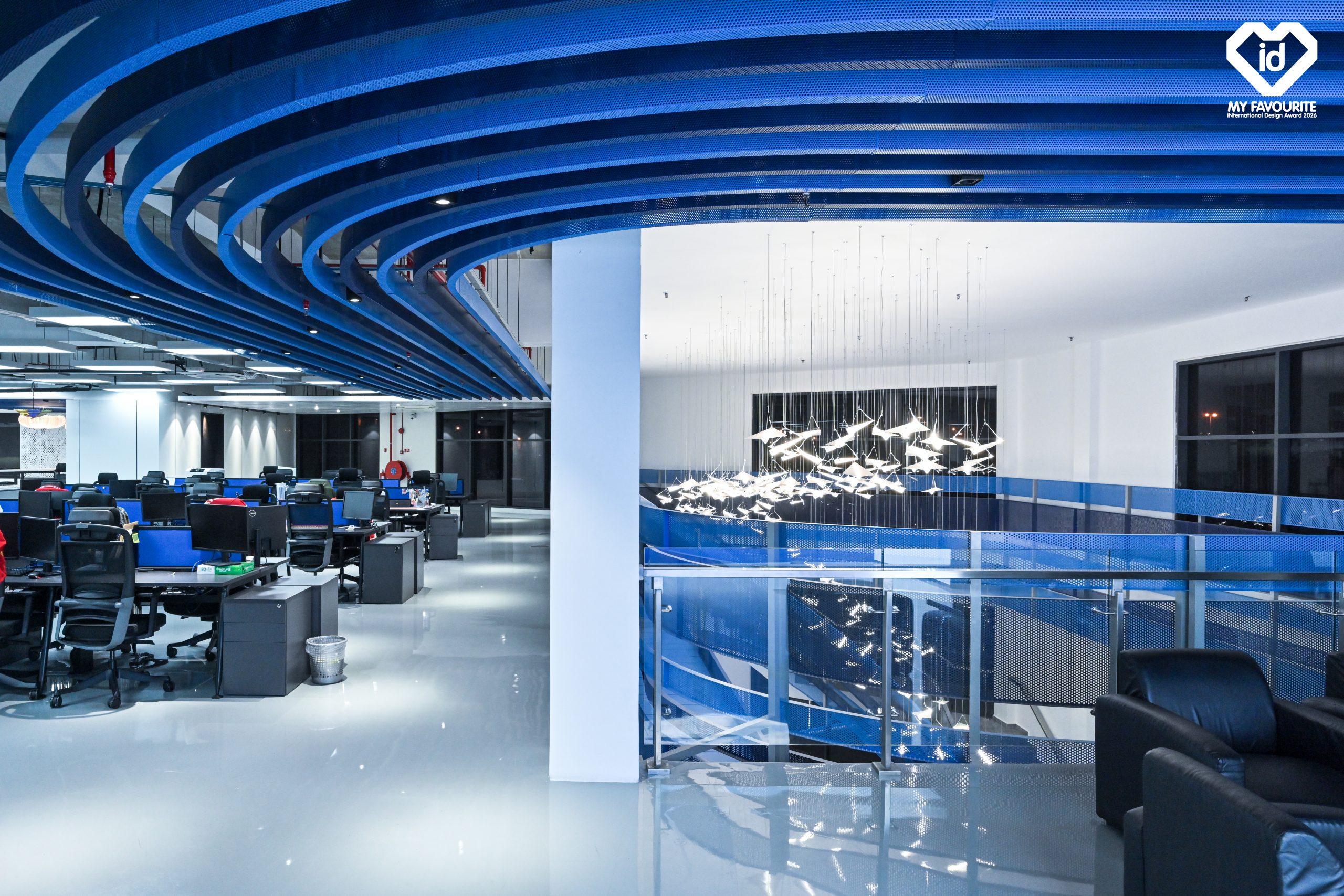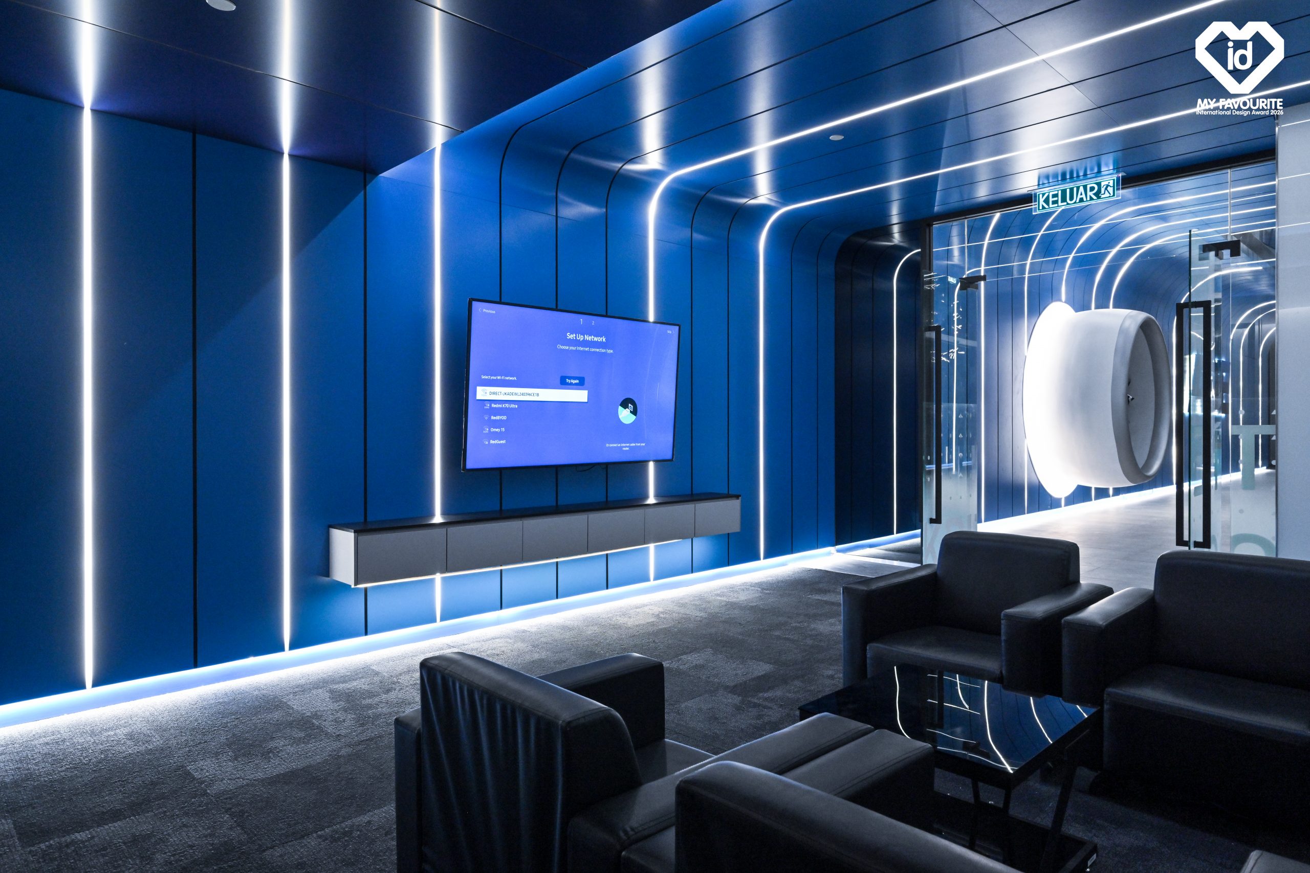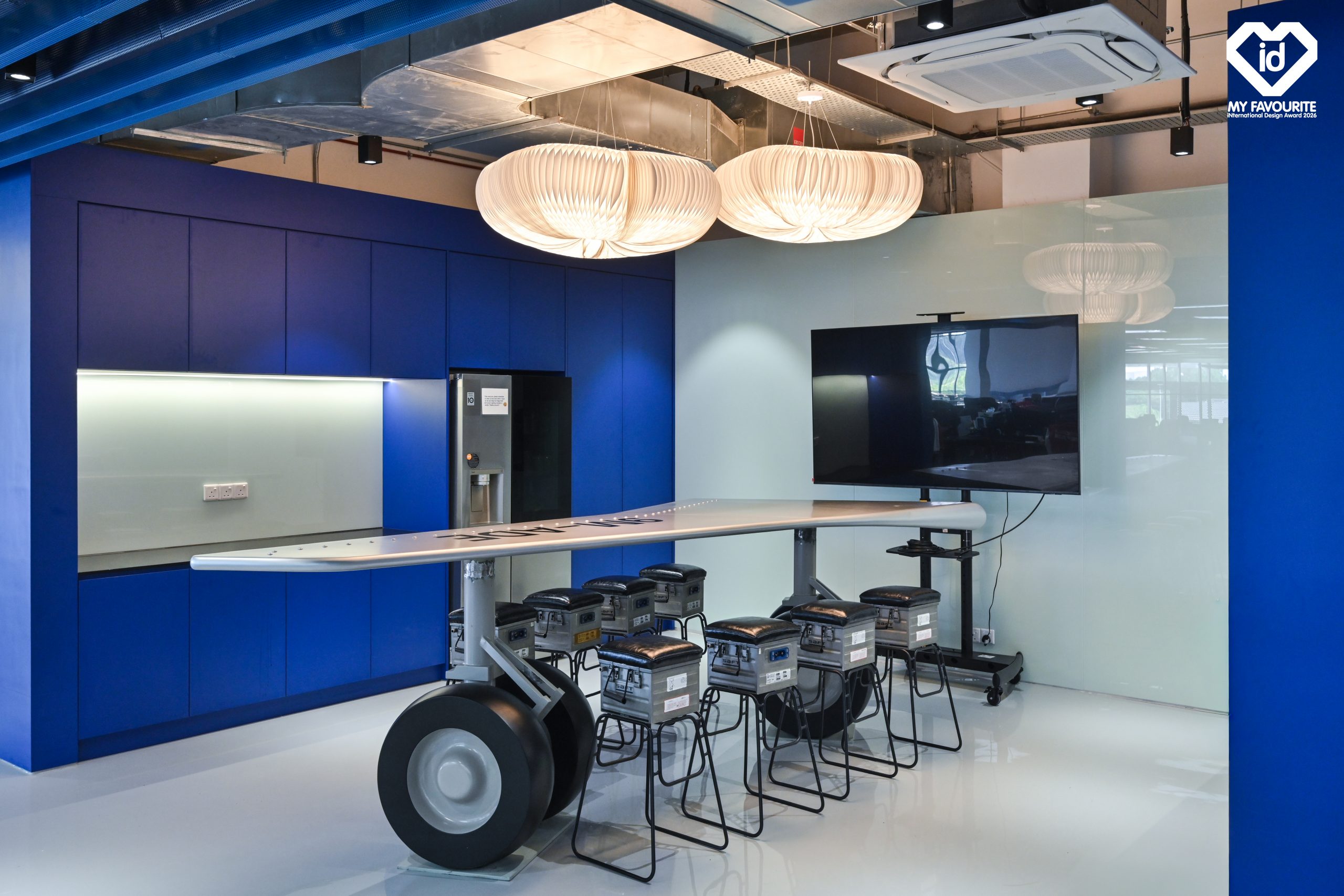 空間中央設置雕塑化引擎模型,作為視覺焦點,直接呼應品牌專業。牆面與天花延展弧形鋁複合板(ACP),形成連續的流動曲面,並結合線性燈光貫穿其間,如同跑道導引線與氣流軌跡般,引導視線與動線向前推進。整體以品牌標誌性的藍色為主調,搭配金屬質感與俐落線條,塑造出富未來感的空間形象。