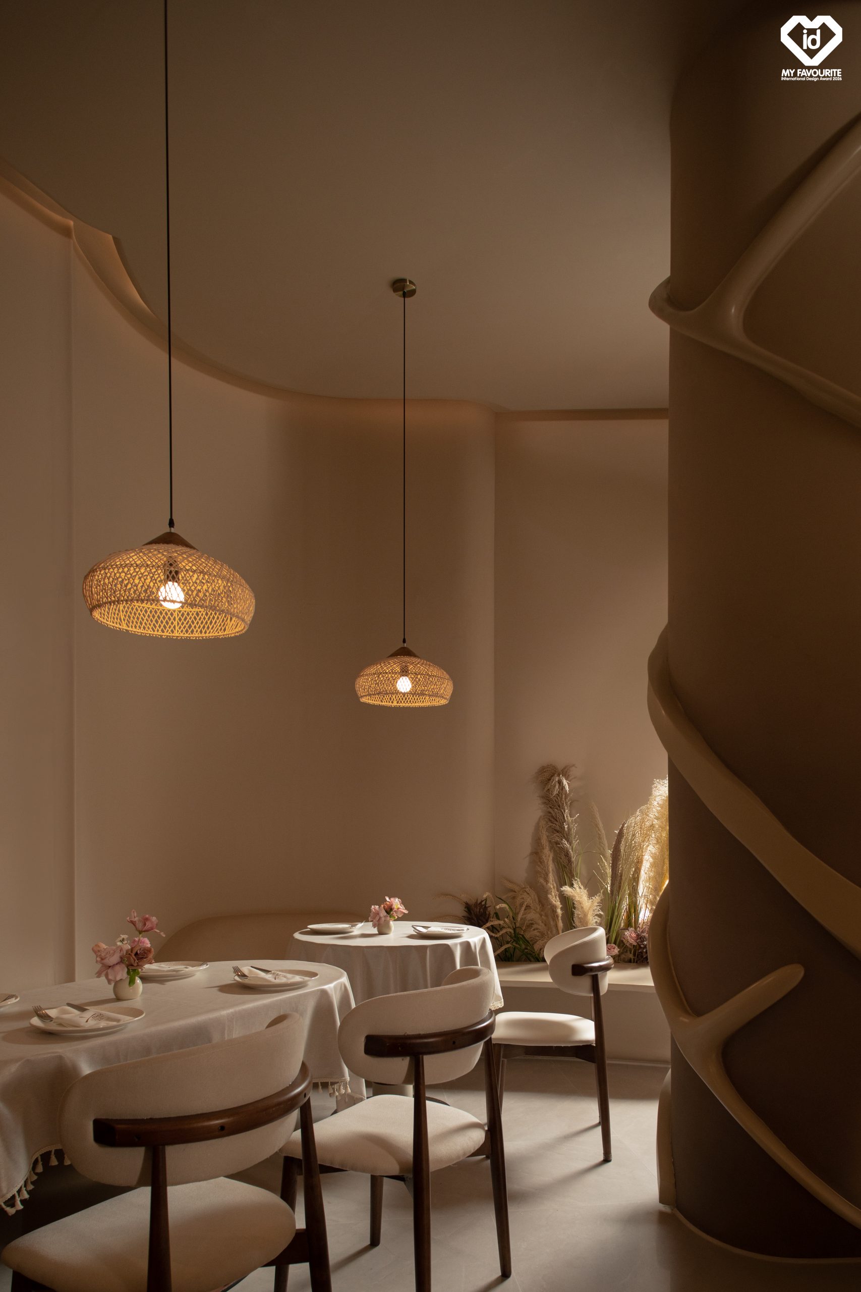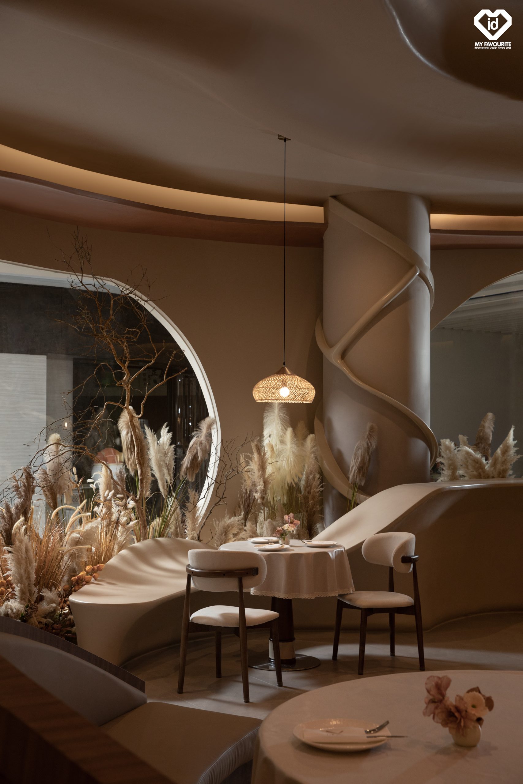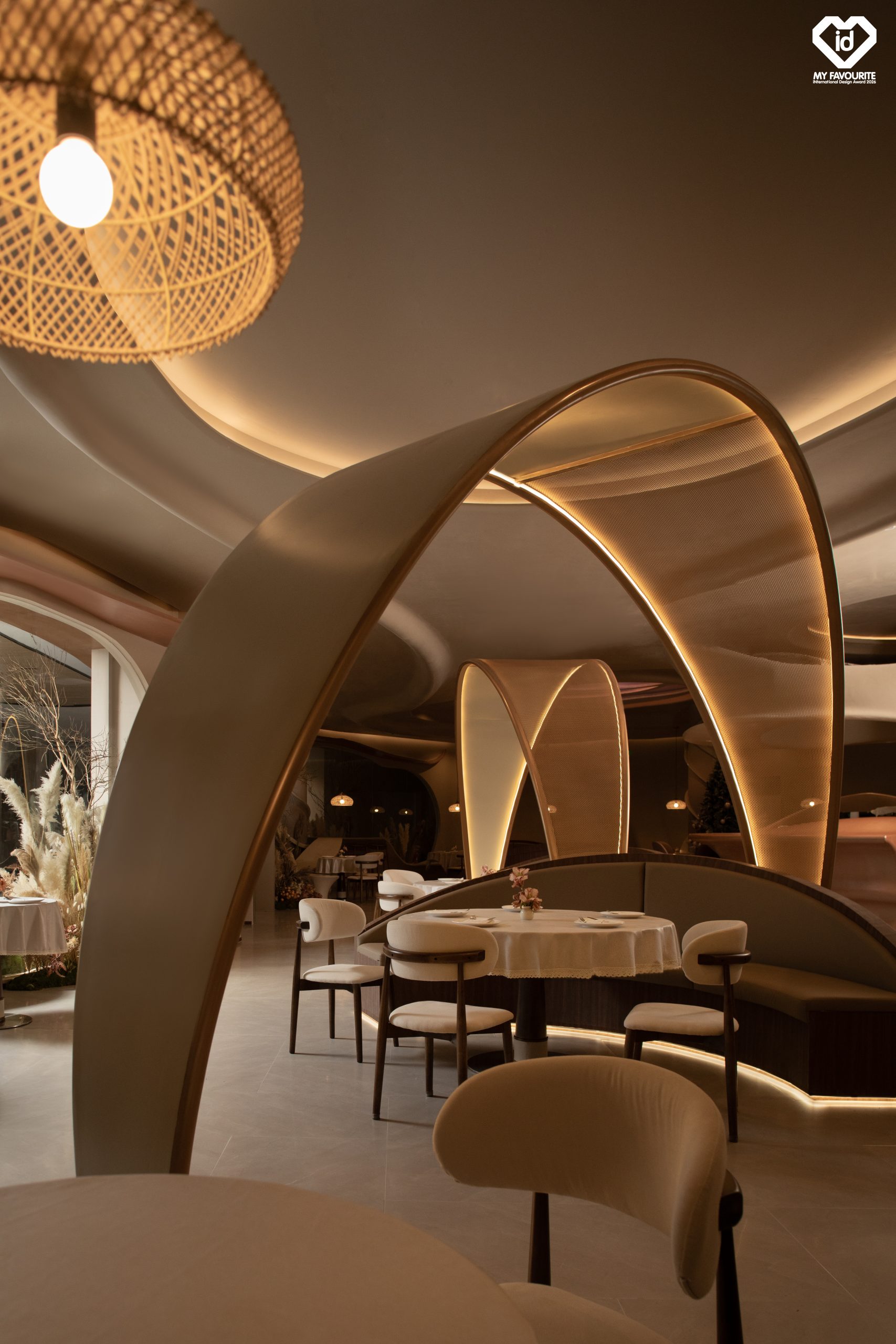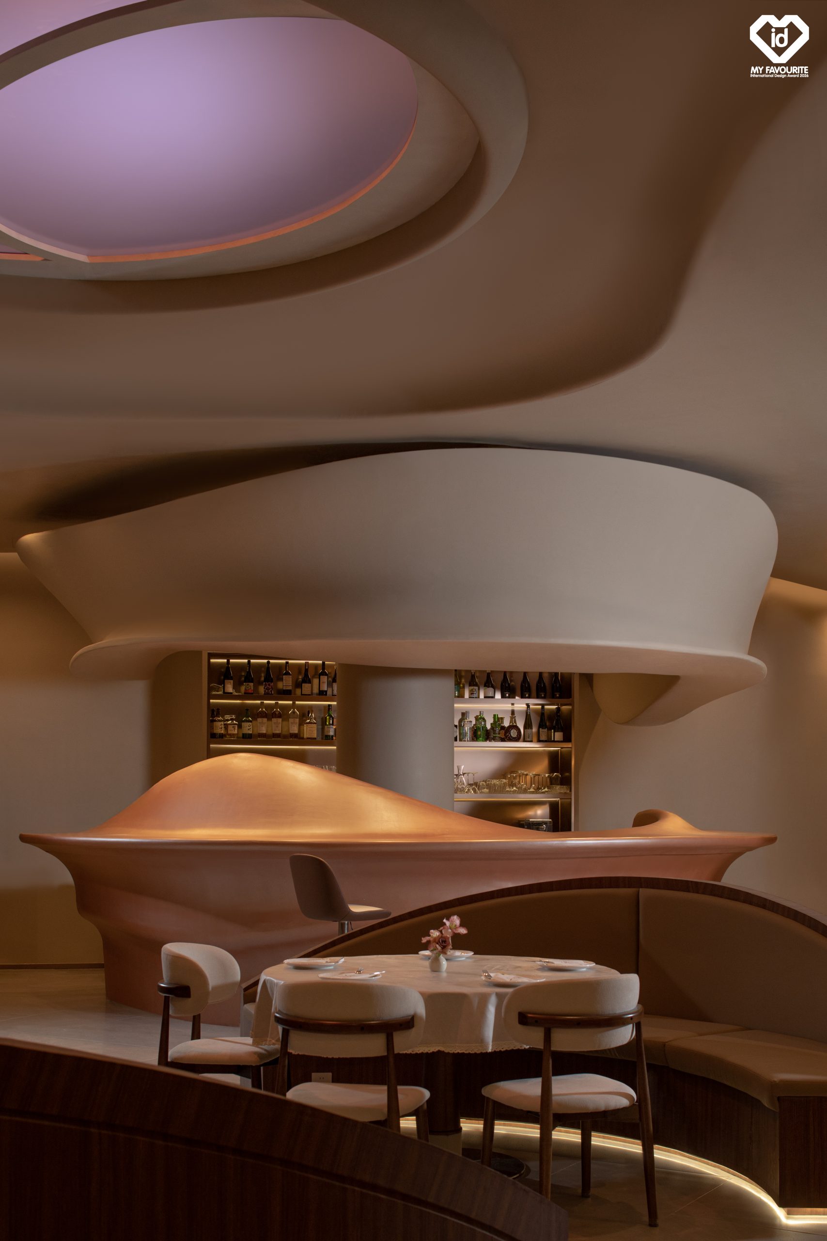 設計刻意模糊空間邊界,使人流動線自然生成,也讓用餐體驗融入靜謐與靈動並存的氛圍之中,彷彿自遠古而來、向未來延伸的視覺敘事,在光影與材質交織下緩緩展開,實現人、空間與自然之間的詩意共鳴。