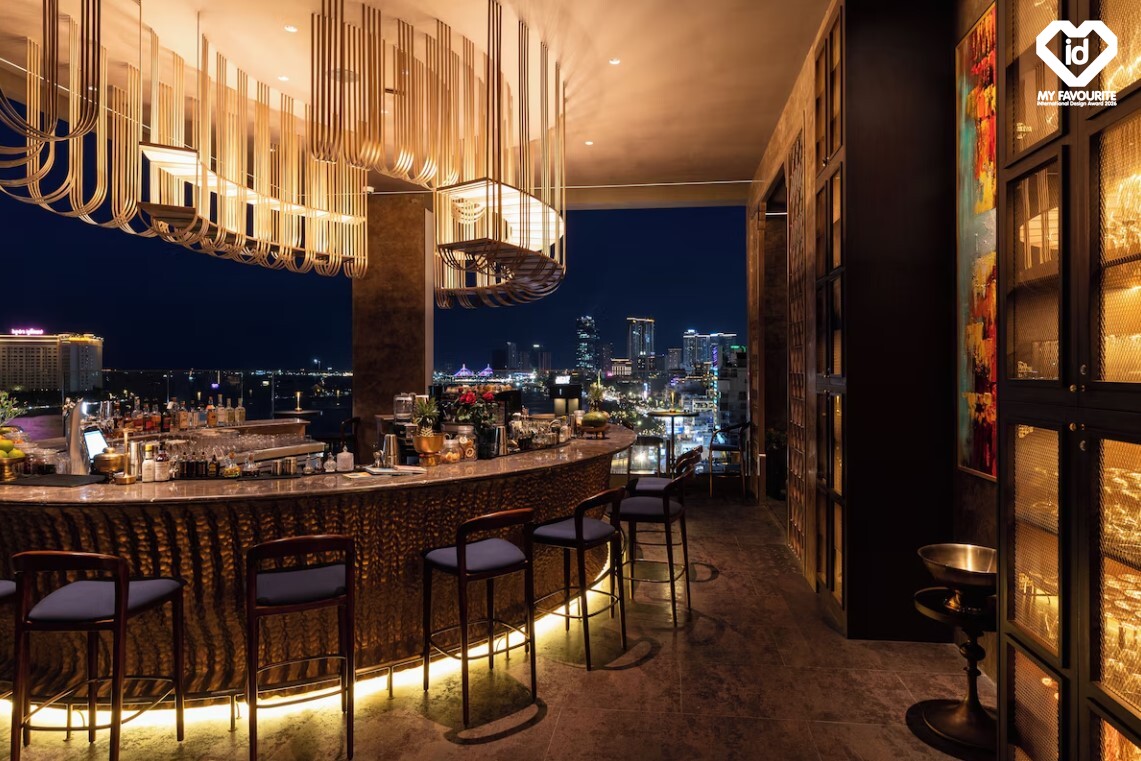 設計團隊從在地工藝汲取靈感,透過三個關鍵層次構築場域體驗:一,以浮雕手法將河流抽象線條壓印於銅質藝術牆板,形塑富有張力的建築表情;二,運用藤編、竹材與草編等在地素材,轉化為具穿透感的現代結構,回應永續與地方韌性;三,將原屬皇室專用的高棉絲織圖紋融入訂製家具細節,為空間注入低調卻深刻的文化層次。