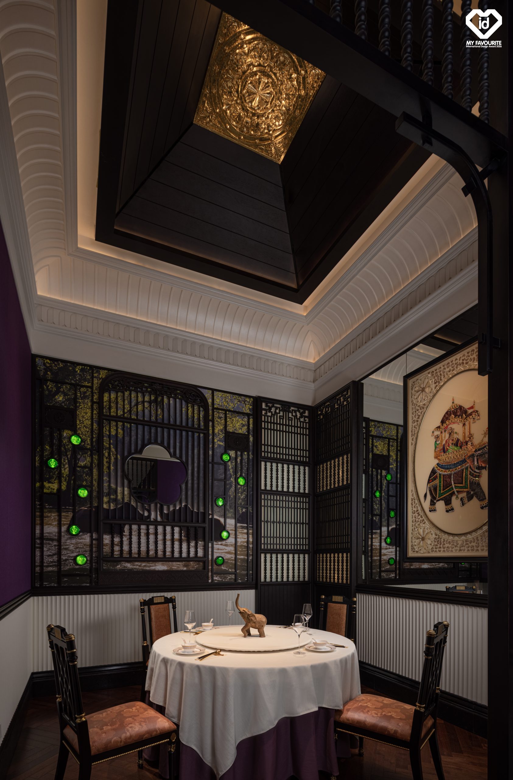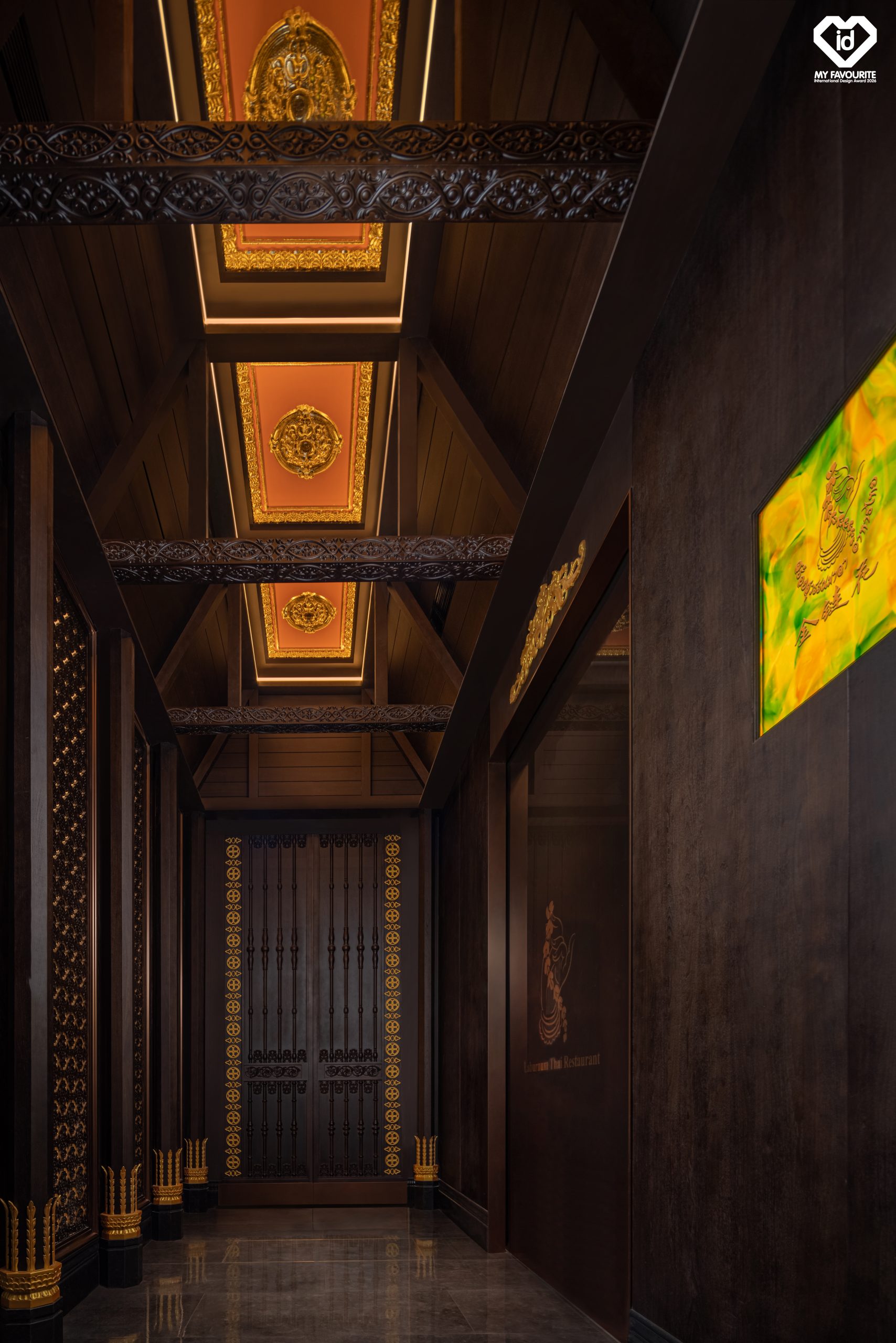 空間語彙取材自泰國宮殿與寺廟建築,柱頭翹角、金箔細節、木雕工藝與珍珠鑲嵌等元素,經過轉化後散佈於各處,形塑出細緻丰富文化底蘊的氛圍。整體調性偏向低飽和與柔和光影,透過明暗對比,帶出沉穩的空間氣質,也呼應品牌所強調的高端泰式料理形象。