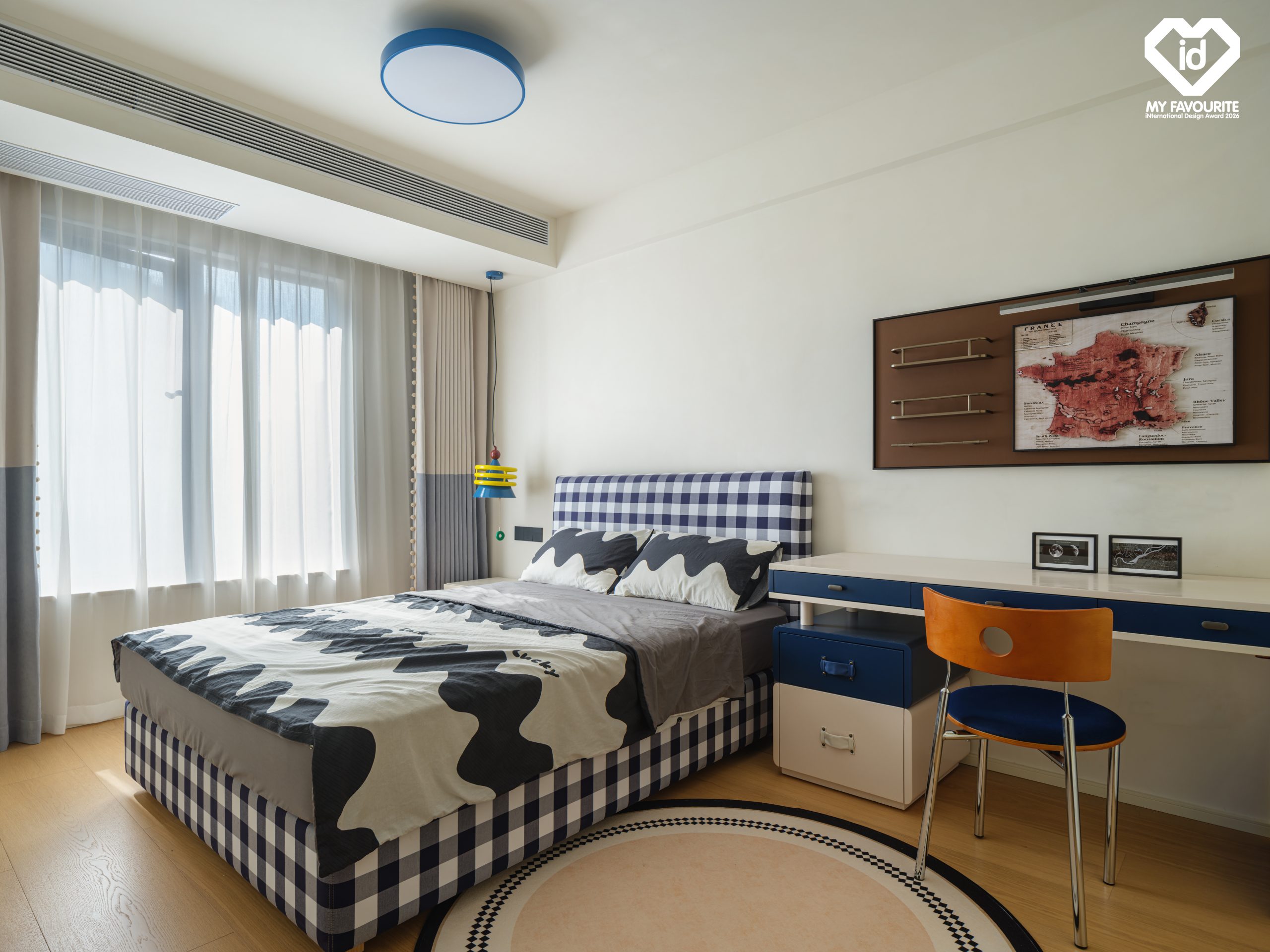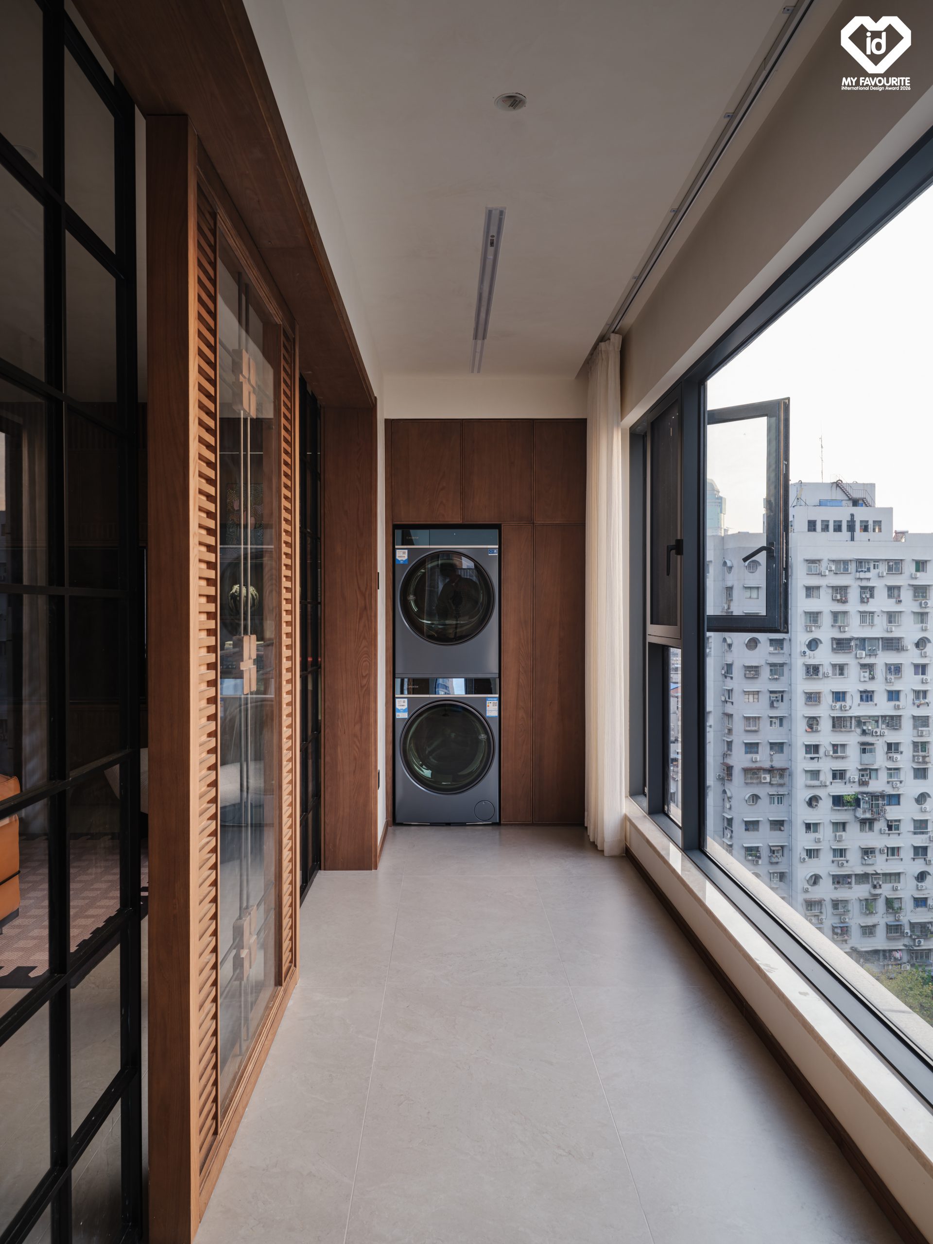 私密區域回歸療癒本質,主臥以柔和材質與一體化收納牆構築安定背景;次臥採榻榻米地台整合睡眠、收納與活動機能。衣帽間以雙面收納牆結合木質與玻璃,提升使用效率,同時維持沉穩質感。兒童房以藍白色系營造輕盈明亮的「想像基地」,嵌入式薄櫃、洞洞板與床尾衣櫃構成可調整的展示與收納系統。生活陽台結合家政與晾曬機能,透過玻璃隔門彈性界定場域。整體設計以系統化收納與簡潔結構支撐日常變化,讓空間成為陪伴孩子成長的溫柔港灣。