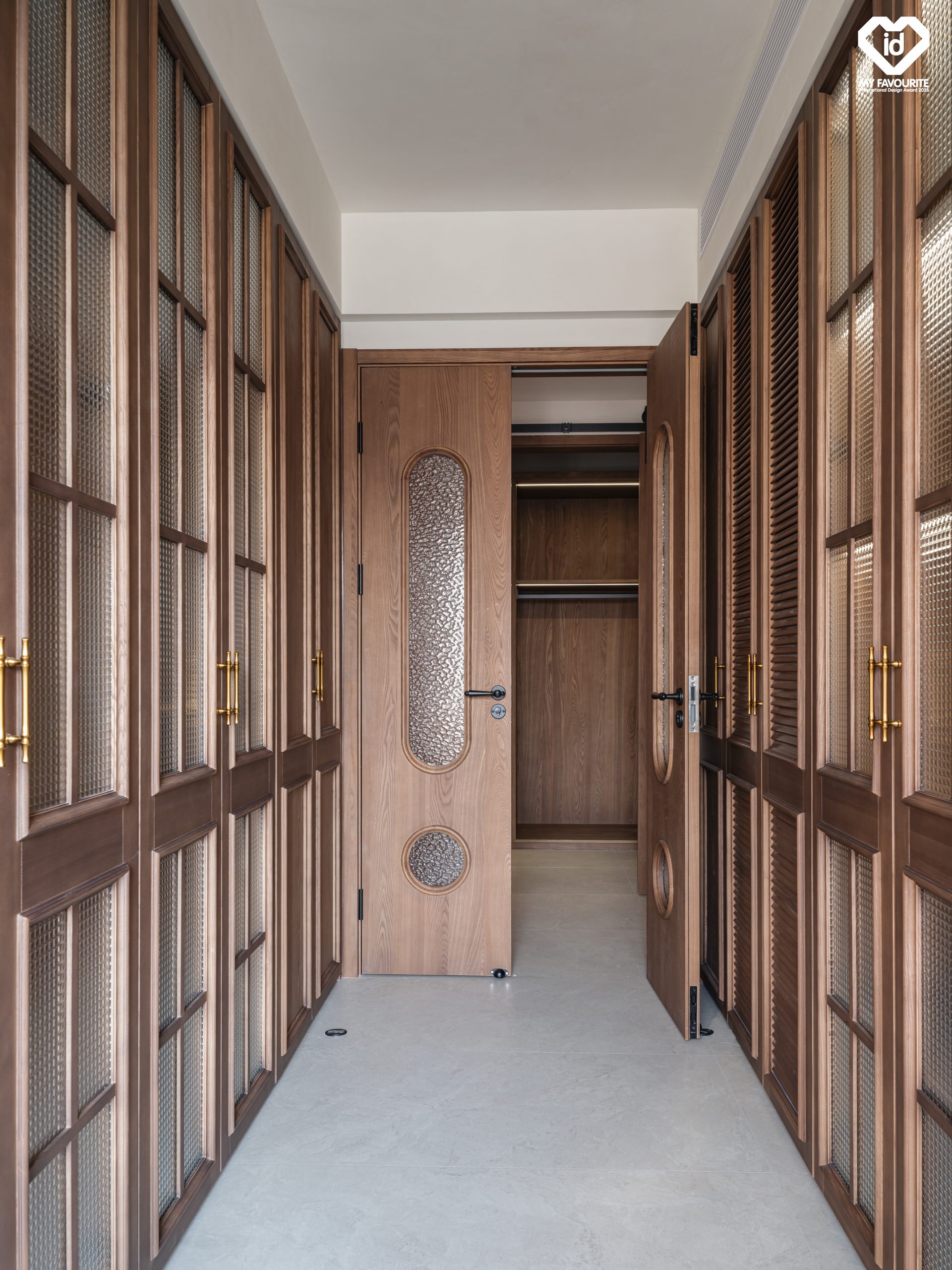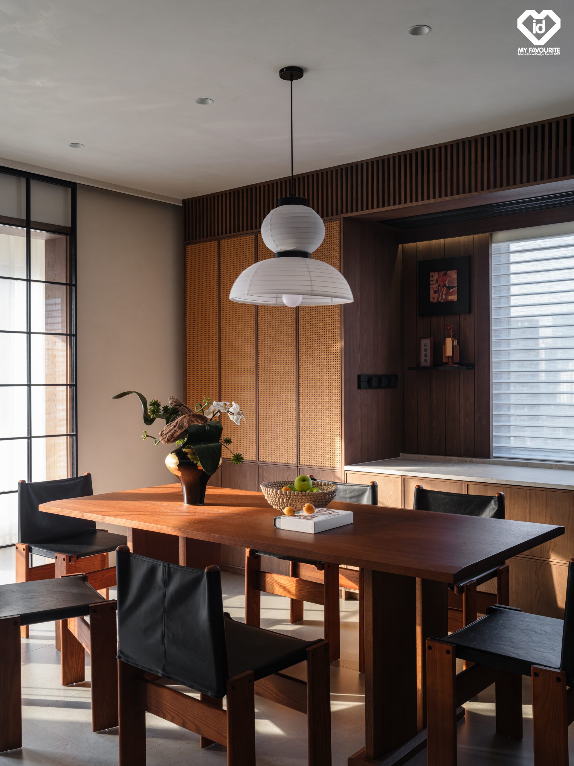 設計打破原有局促界線,將客廳、餐廳、門廳與陽台整合為連續開放的互動場域,使光線與風景自由穿行。公共區域不再被牆體切割,而成為承載日常節奏的生活舞台,從清晨匆忙到夜晚團聚,家庭活動自然流動其間。廚房透過聯動門實現開合雙場景:備餐時獨立控煙,日常則與餐廳相連,形成開放共享的生活核心。訂製西廚櫃延展操作尺度,使備餐、烘焙與飲水動線一氣呵成,胡桃木基調營造溫潤而放鬆的居家氛圍。
