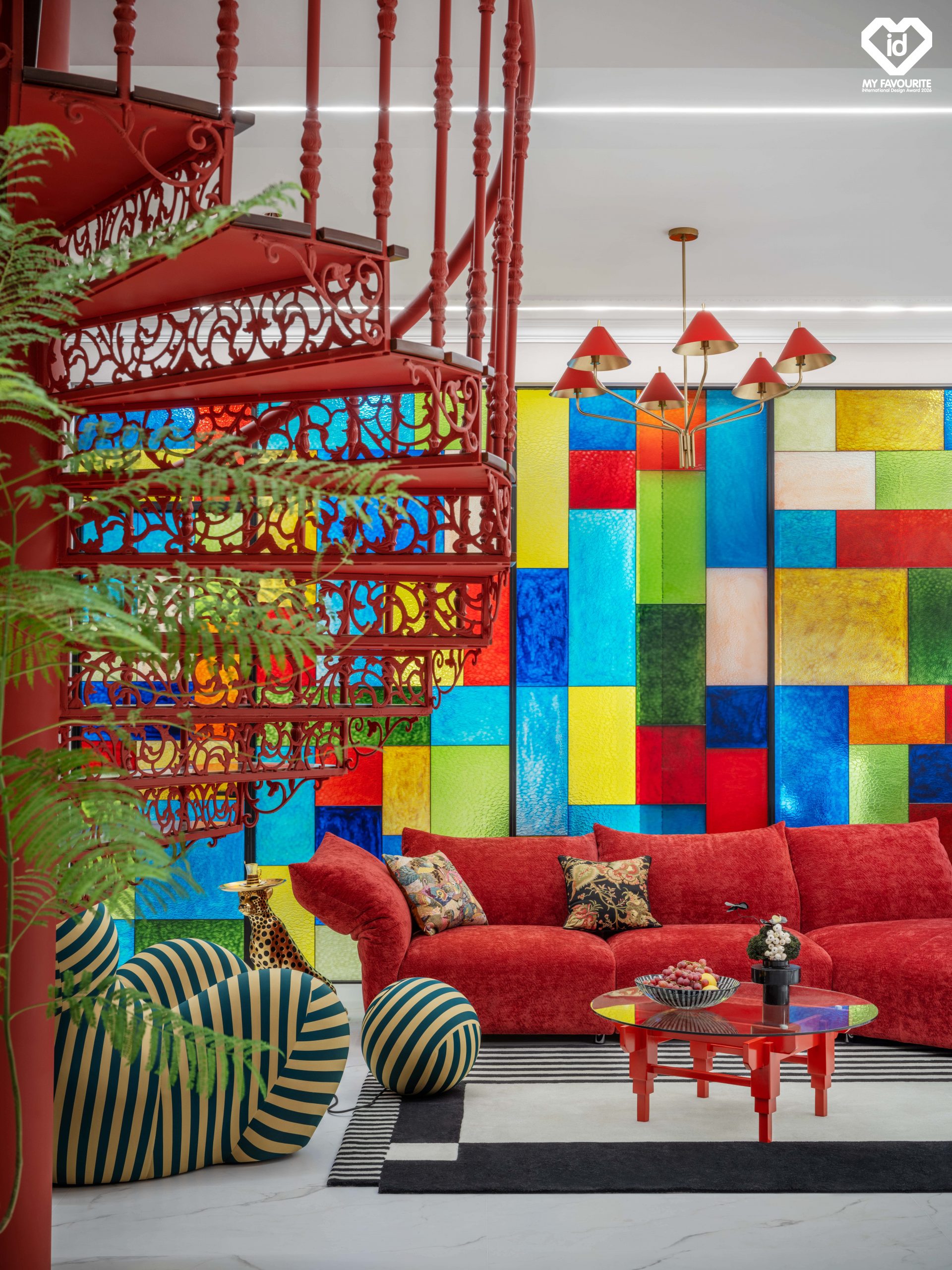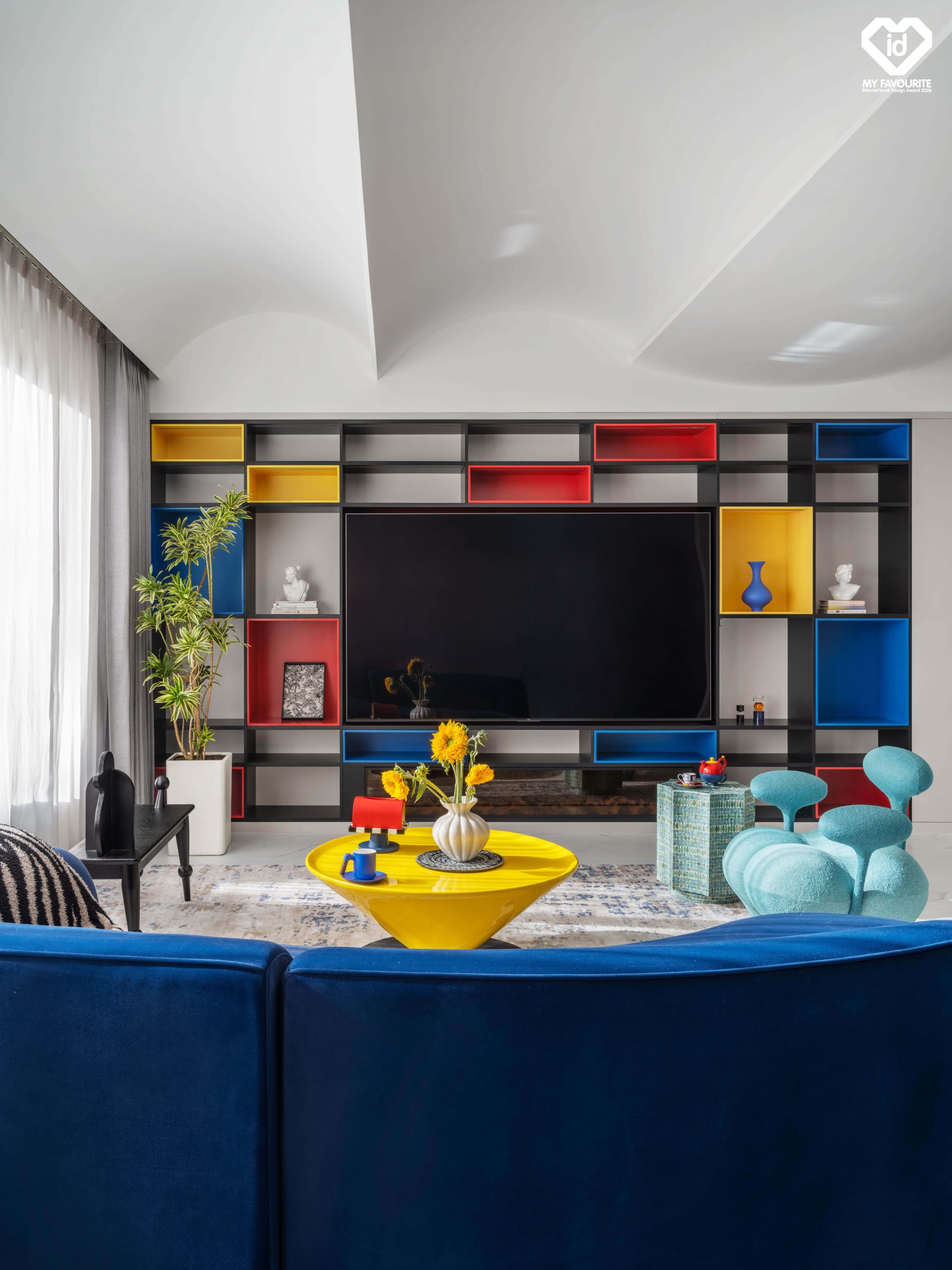 整體概念以「海晏春秋」為題,轉譯蒙德里安式的幾何秩序與三原色語彙,將抽象藝術轉化為可居住的空間語言。別墅如同一幅可走入其中的畫作,紅、黃、藍在極簡構圖中自由組合,既理性克制,又富於情感張力,回應「將複雜生活抽象為精神符號」的核心命題。