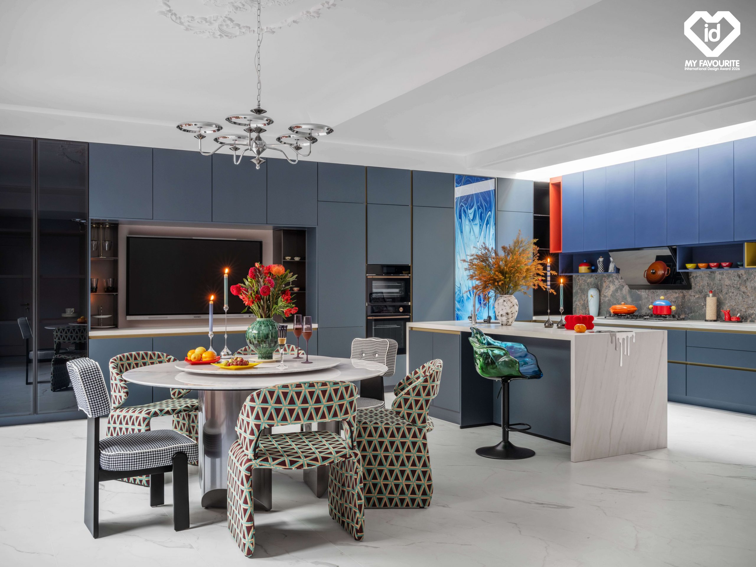 客廳作為情感核心,需兼具明亮尺度與精神表達。克萊因藍沙發、明黃色茶几與童趣裝飾彼此對話,形成如文學排比般的節奏與隱喻。餐廚區延續色塊結構,深藍櫥櫃與紅色酒櫃構築冷暖對比,使理性秩序與生活溫度並行共生。