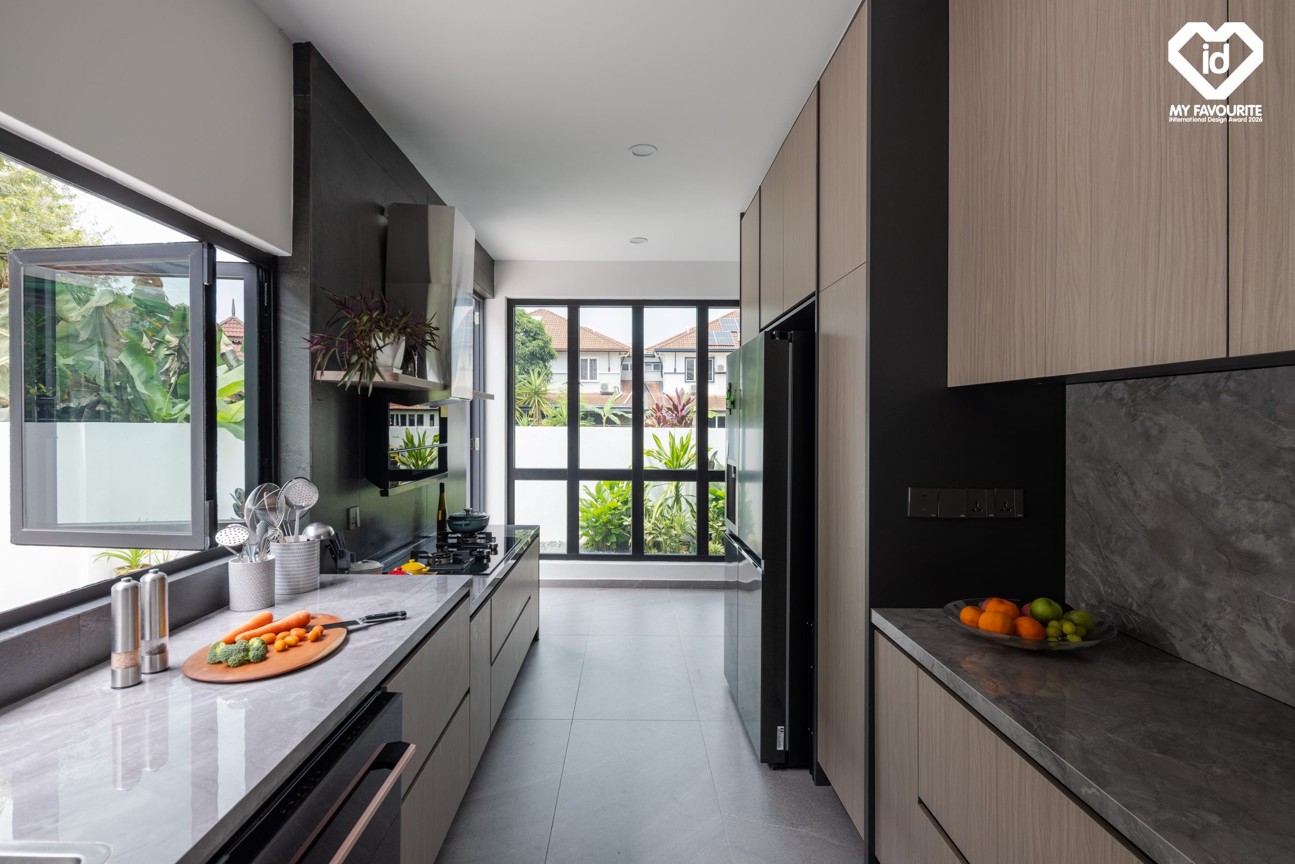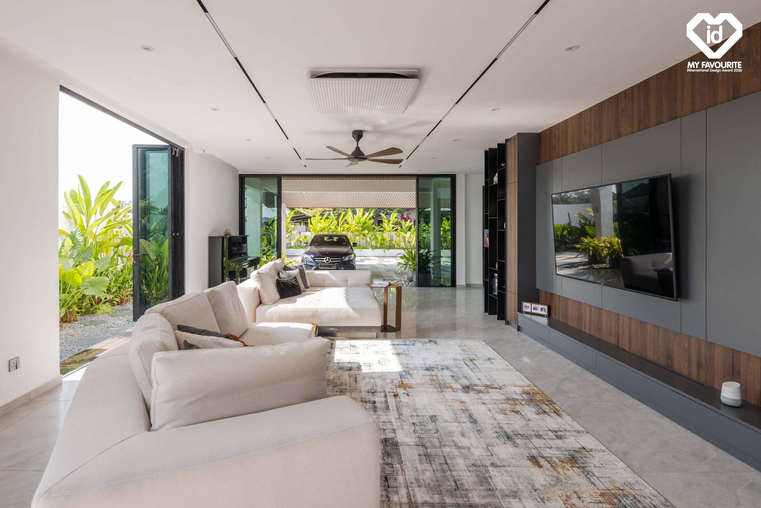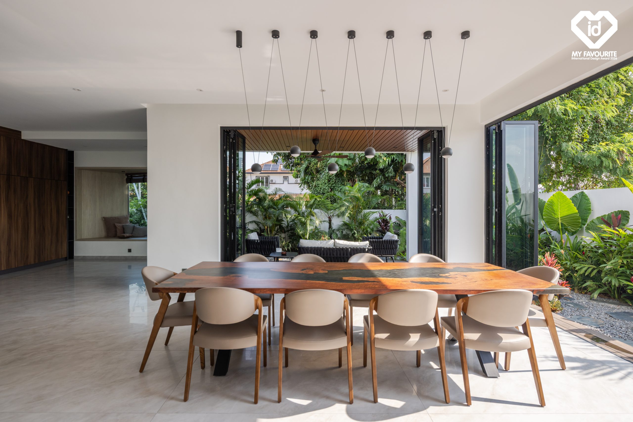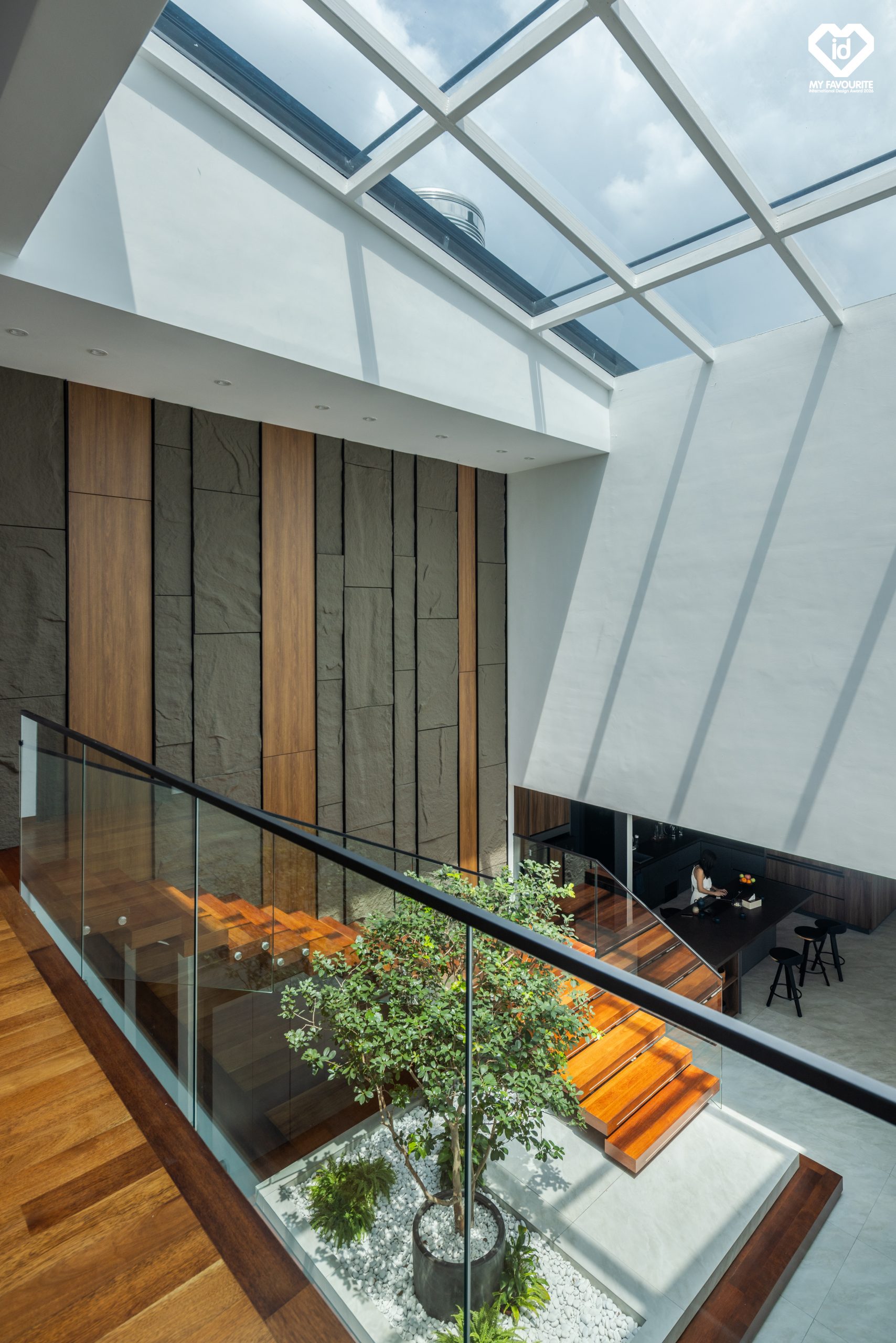 本案以「會呼吸的住宅」為概念,從光線、自然與空間連續性出發,重新思考居住與日常生活的關係。建築以中央挑高的內院作為空間核心,將自然光、空氣與綠意引入室內深處,於不同時間呈現光影變化,也讓空間在垂直與水平之間,產生連續的視覺關係。庭院中央保留既有大樹,並以木質平台與石材地坪層層展開,在天窗引入的自然光下,形成室內如庭園般的生活場景。