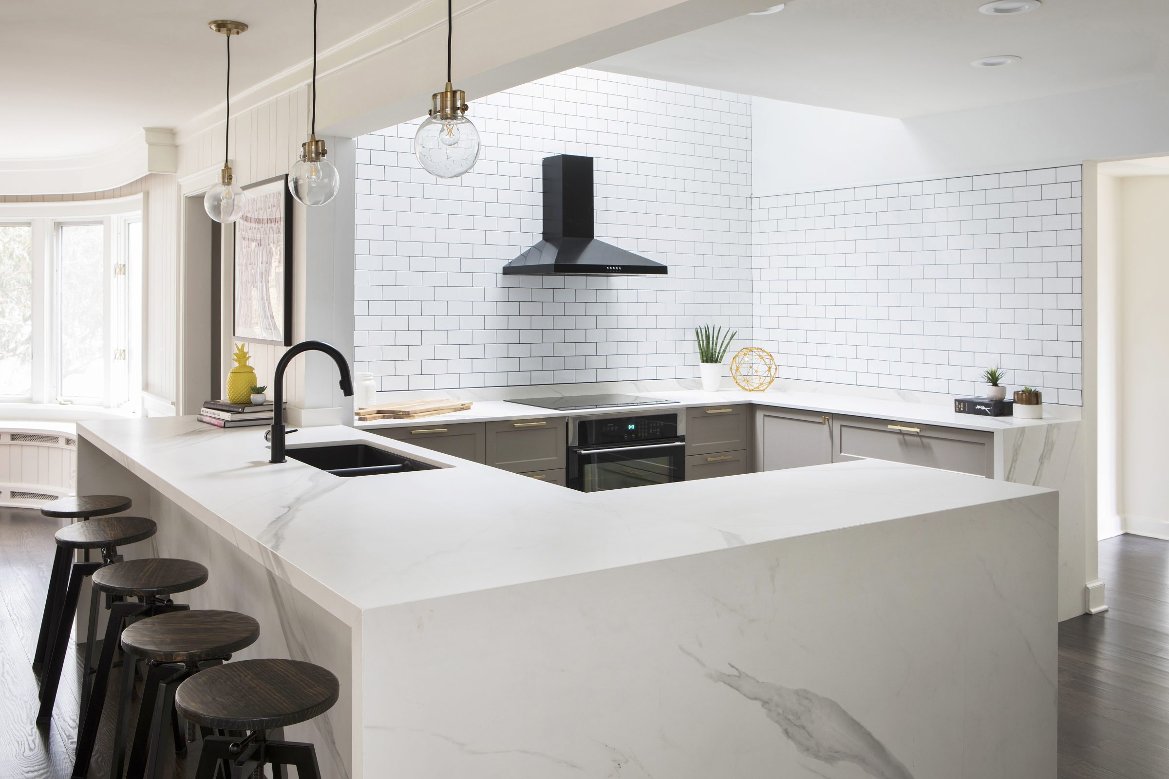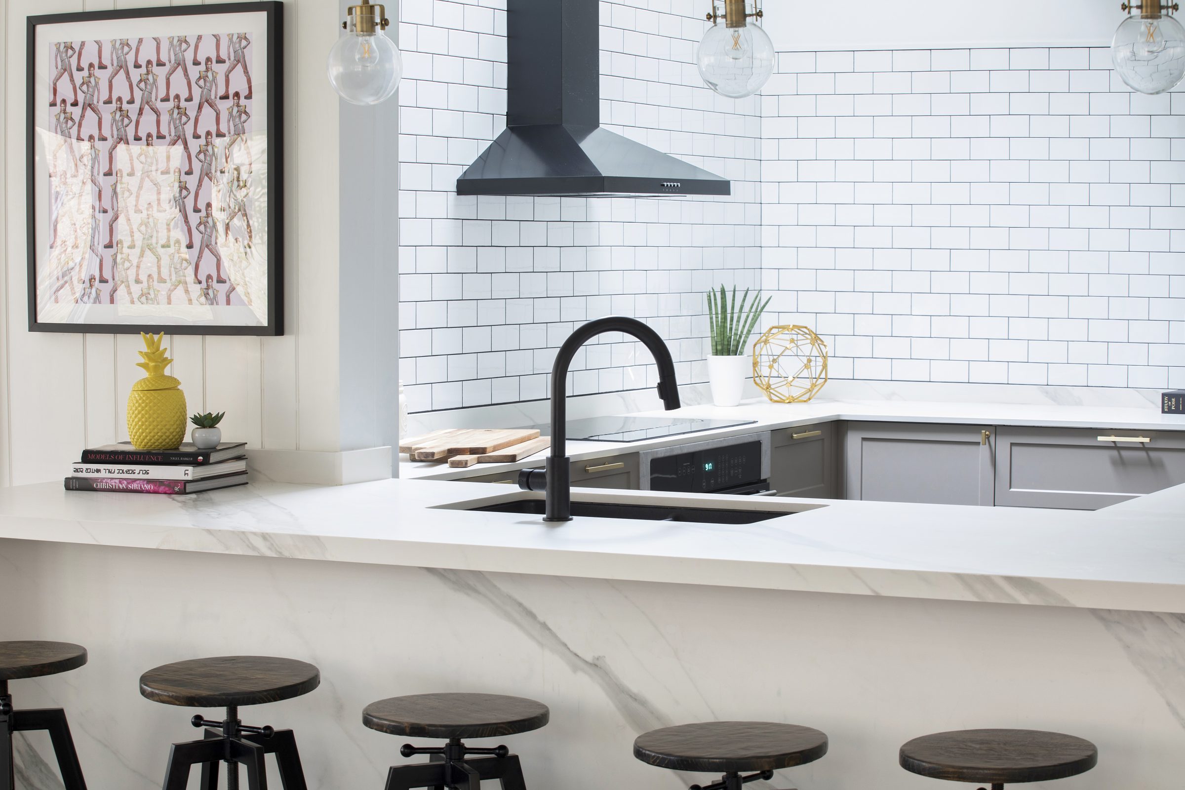 Worktops specified in stunning Dekton Opera with its intricate grey veining complement the bright white metro tiles and black kitchen accessories perfectly. Its waterfall design flows neatly onto the floor, creating a stylish overhang for seating. Ideal for a kitchen project, Dekton is highly resistant to heat, scratches and stains and can easily withstand the demands of a busy kitchen. It’s also incredibly easy to clean.