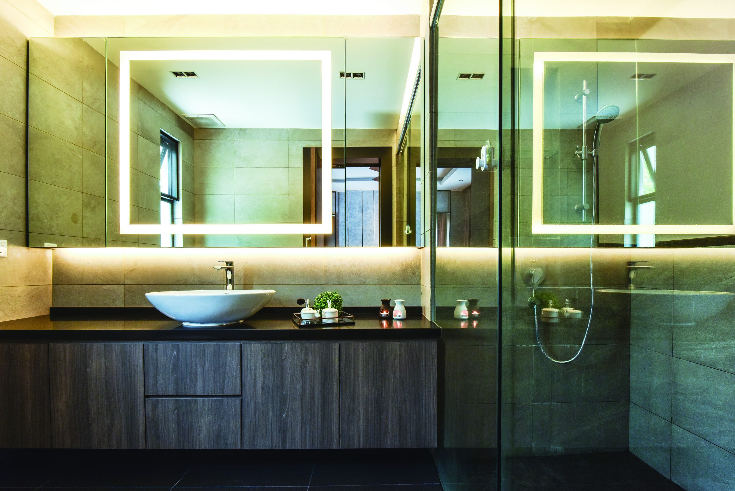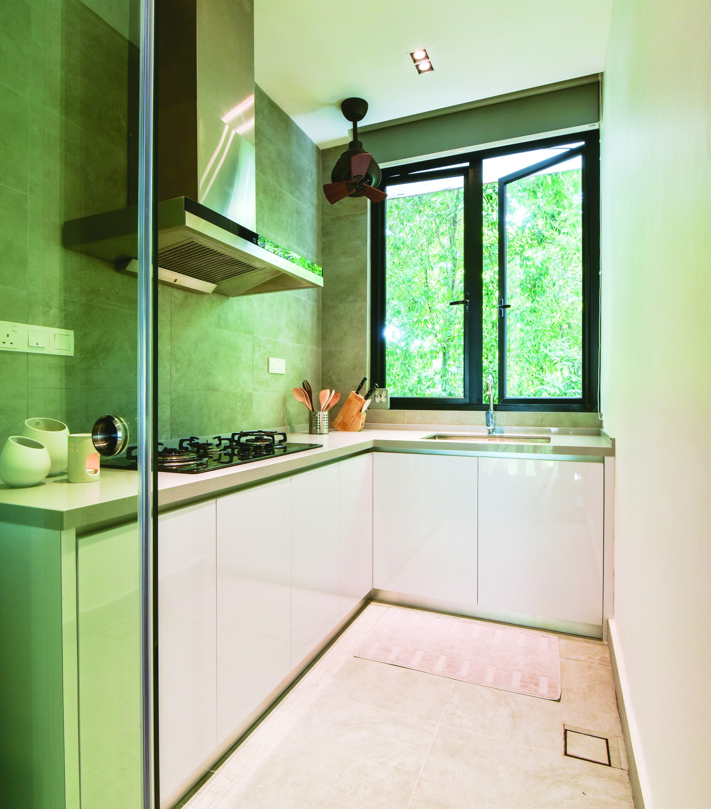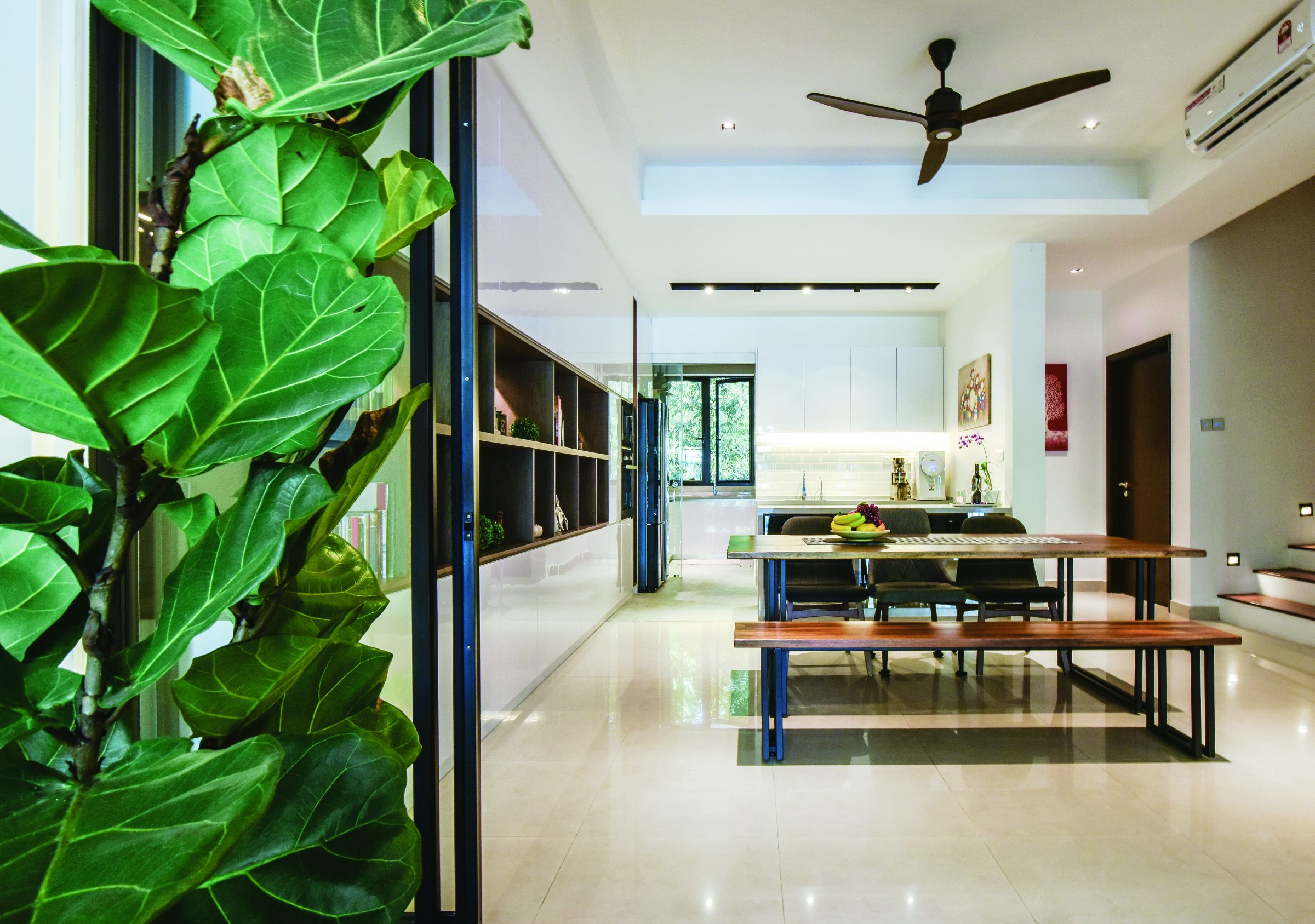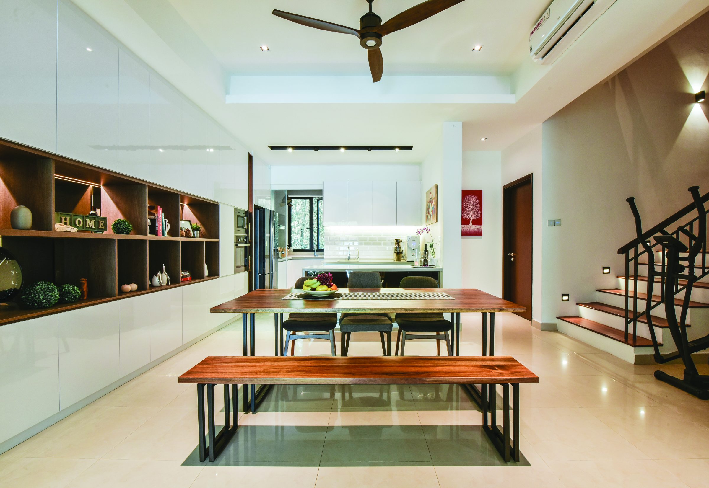 A dose of life is added to the centre of the open layout, contained within glass panes and a frame of black square pipes, a branch from a mature Tectona grandis (teak) tree is rooted and held within a pot in the enclosed air well. The element of the slow-growing tropical hardwood is echoed in the distinct grains of the dining furniture, the wood-accented shelving, doors, and treads of the staircase leading to the upper level. Wood is exchanged for metallic accents across the kitchens: the walls of the wet kitchen are rendered in bare cement – while the backsplash of the dry kitchen is decked with a brickwork configuration of glossy white tiles to match the all-white cabinetry and to echo the whitewashed brick on the other end of the open layout.