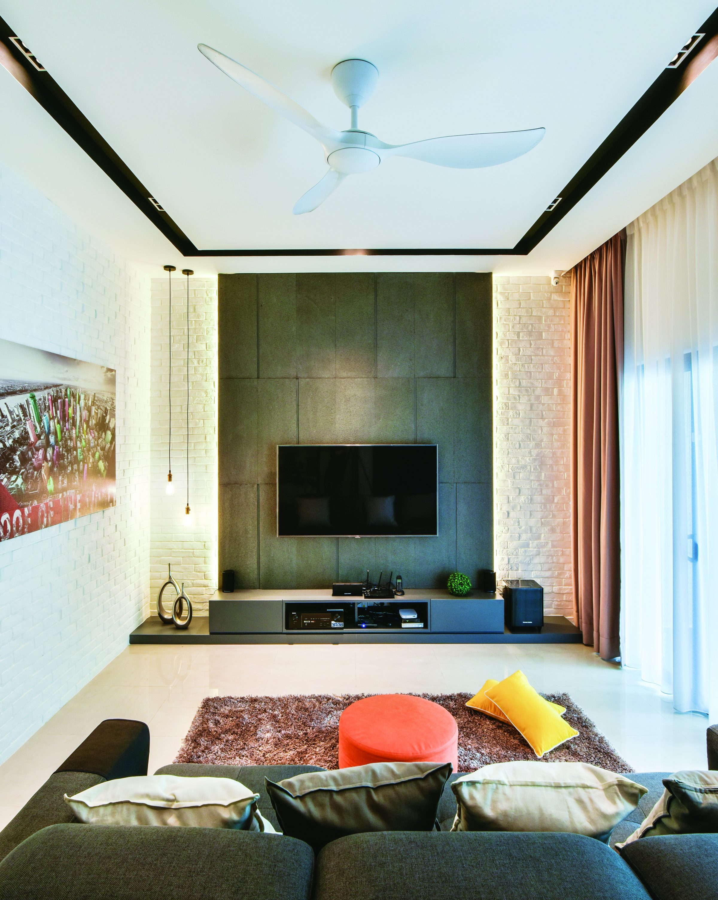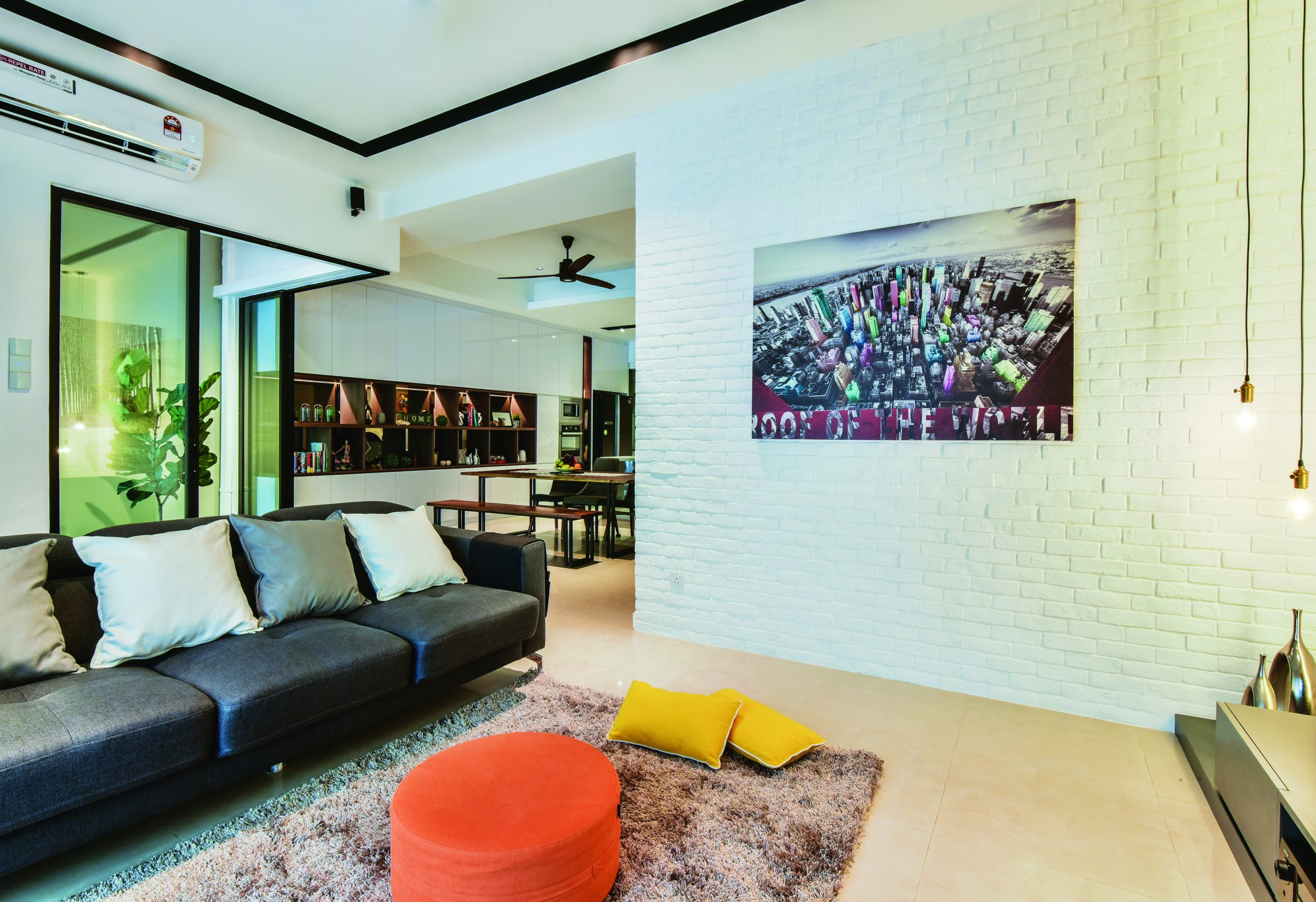 Decorated by Surface R, this home presents an eclectic assembly of moods ranging from the industrial to the tropical, weaved together with an underlying casual vibe. The open layout of this home is rendered in pale architectural finishes: cream floor tiles and whitewashed brick walls meld with a length of glossy white cabinetry spanning the dining and cooking spaces. Colour is introduced with a few select decorations, including a piece of digitally-coloured pop art hanging on a background of whitewashed brick titled “Highlights of the New York Skyline”.
