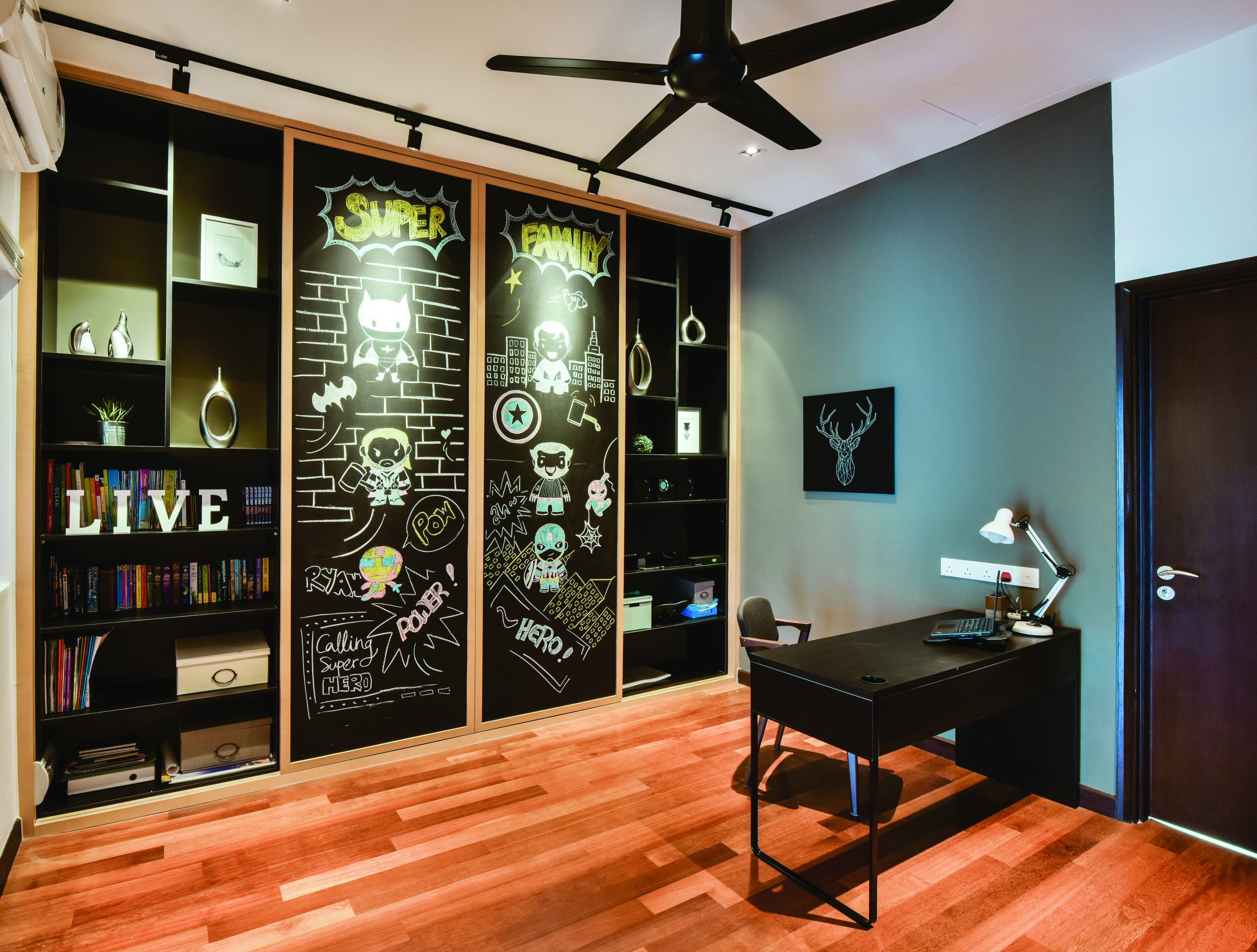 Personalised Portals: The array of doors in the entertainment lounge and the sliding closet doors in the study uniquely serve as blackboards for evolving murals drawn in chalk.