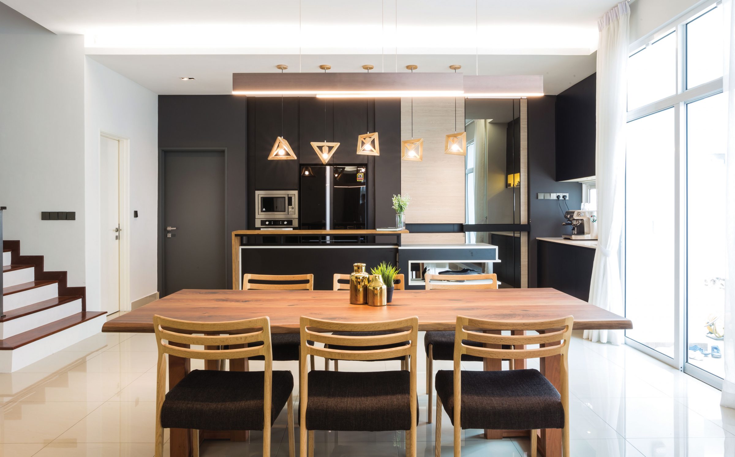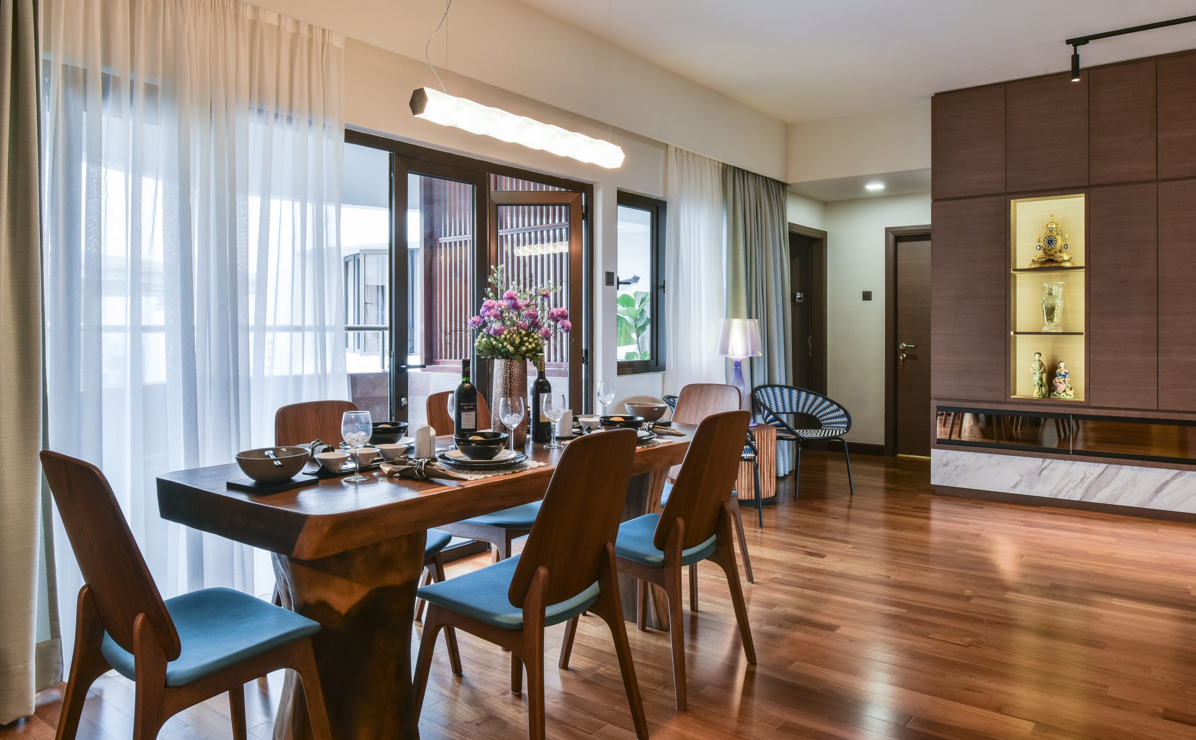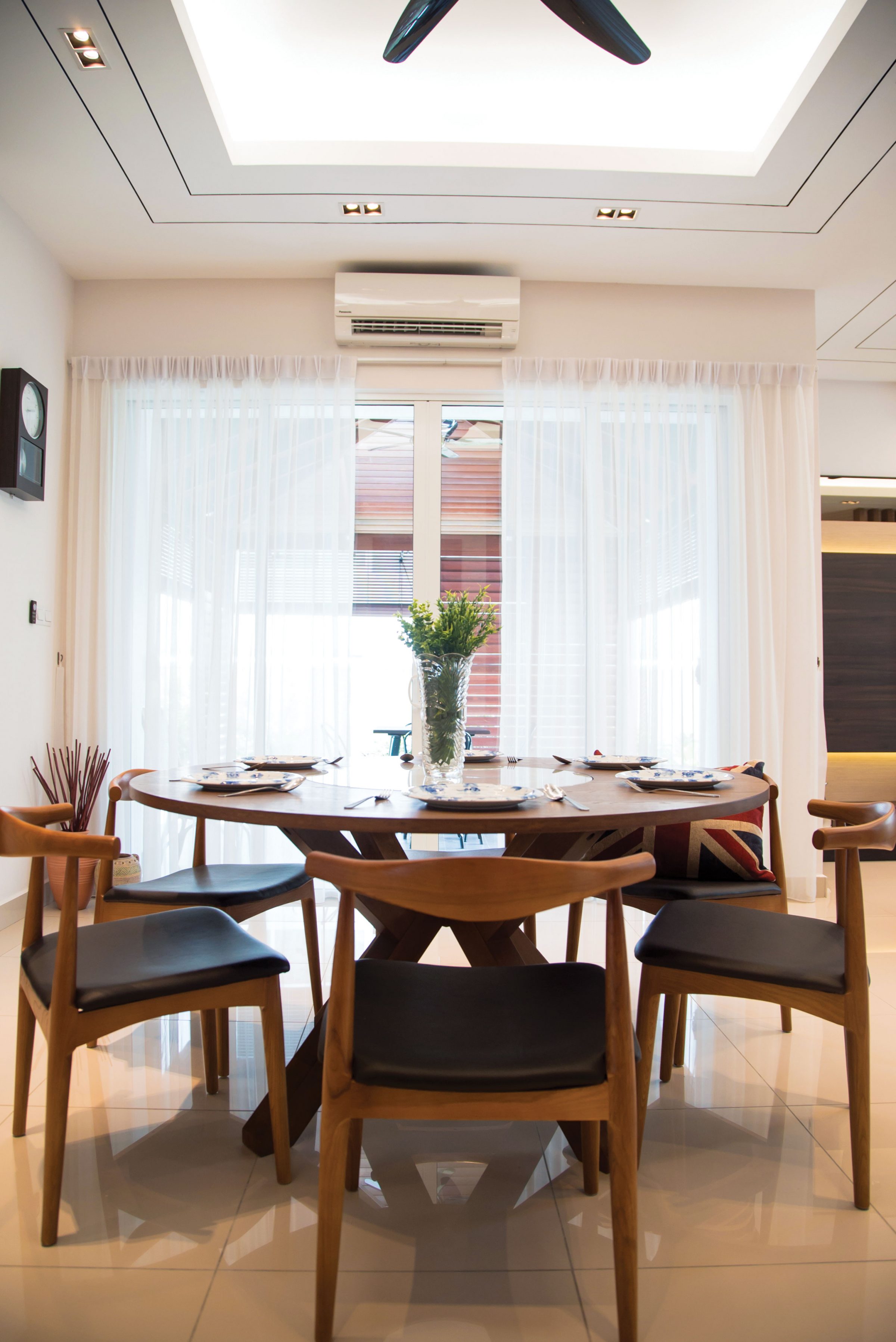 Decorated by Nu Infinity, the pictured dining space is strategically placed opposite a length of sliding patio doors and gifted with sunlight filtered through lightweight sheer curtains.