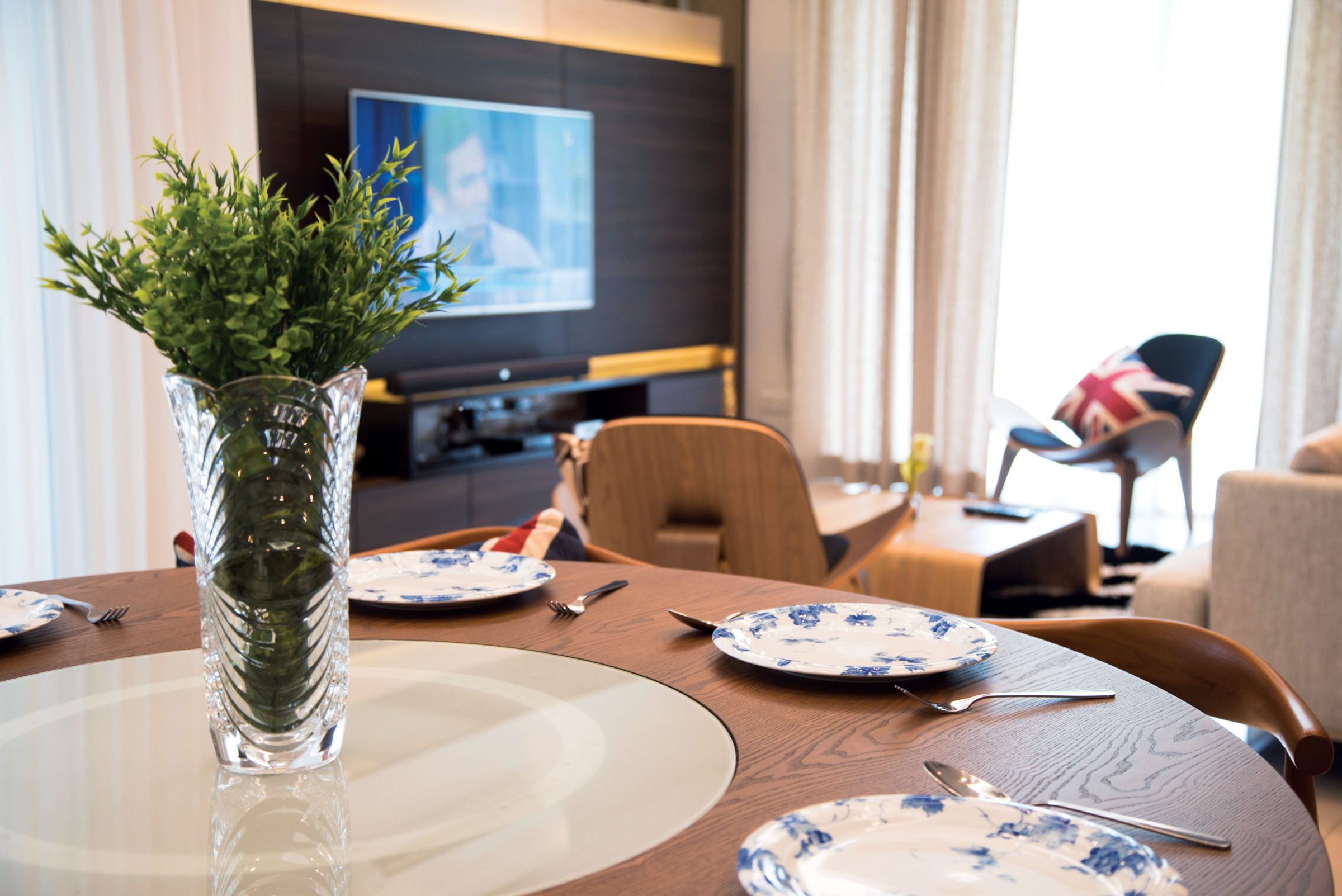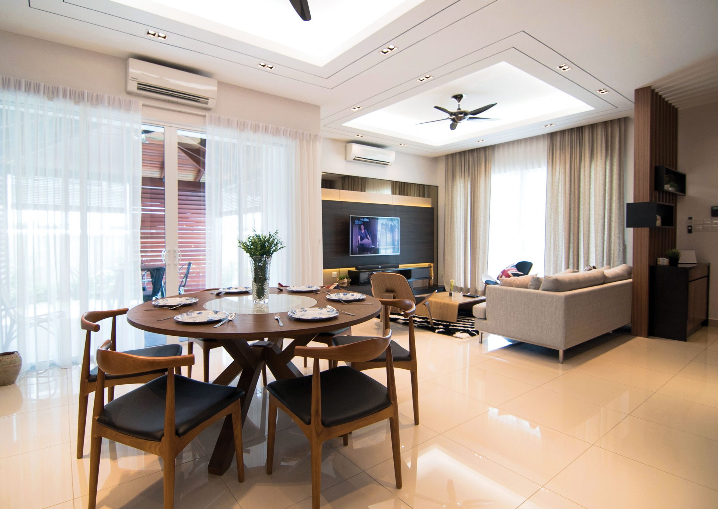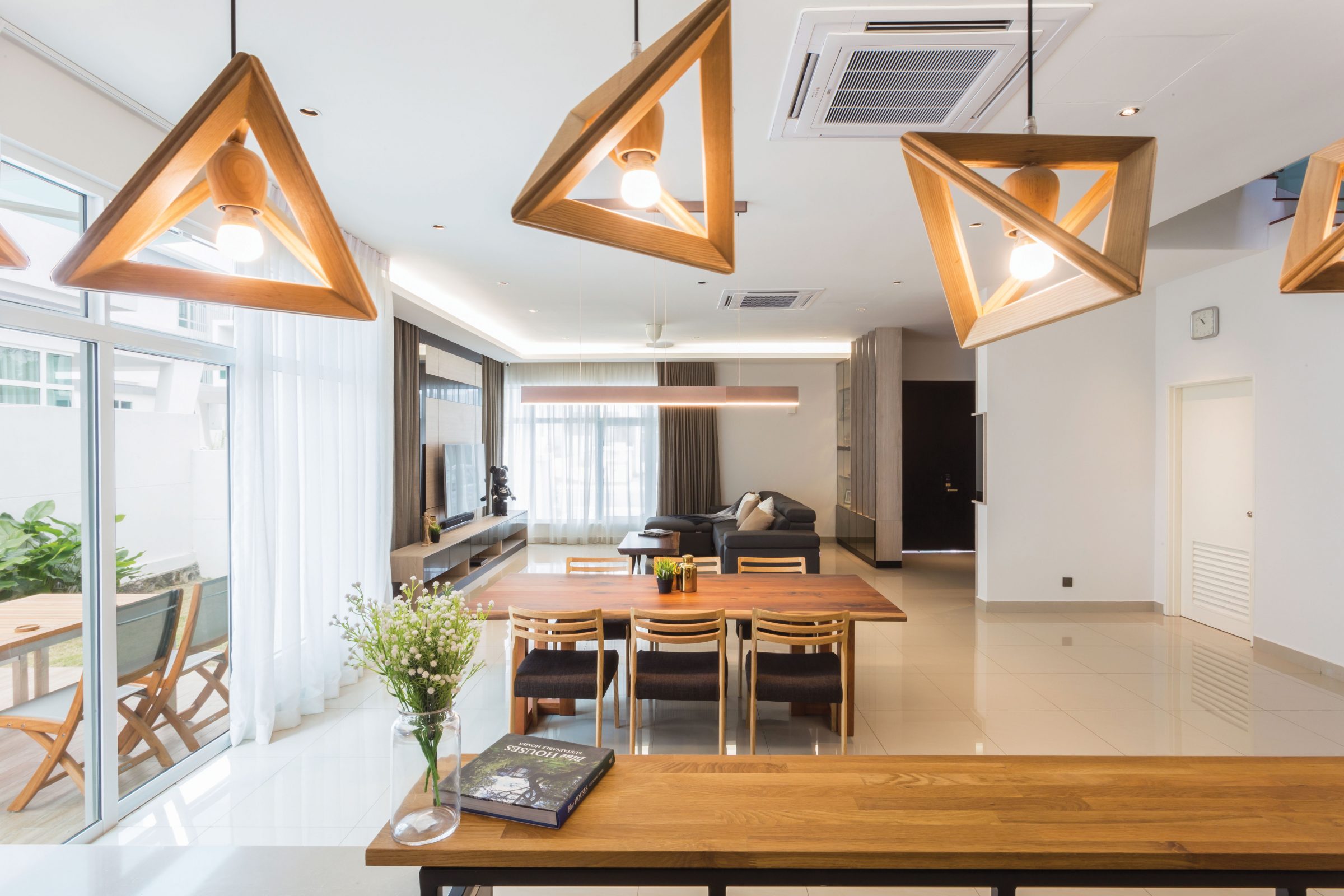 Decorated by Nu Infinity, the pictured dining space is strategically placed opposite a length of sliding patio doors and gifted with sunlight filtered through lightweight sheer curtains.