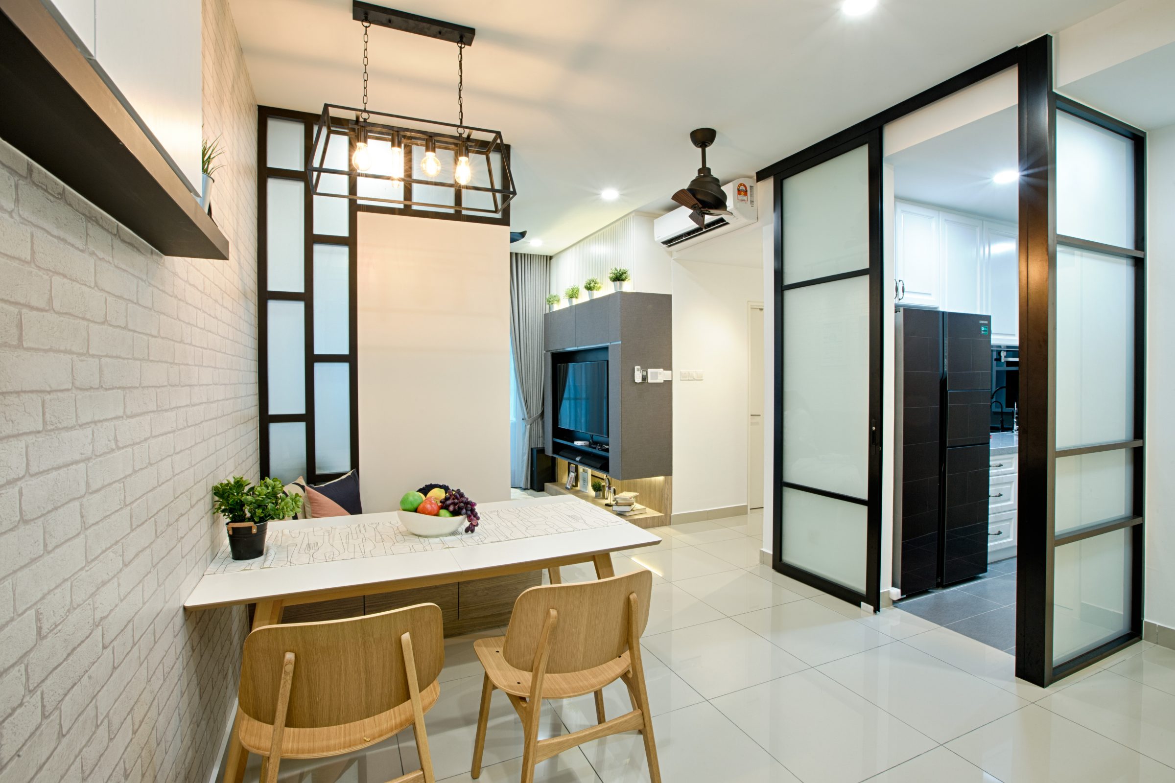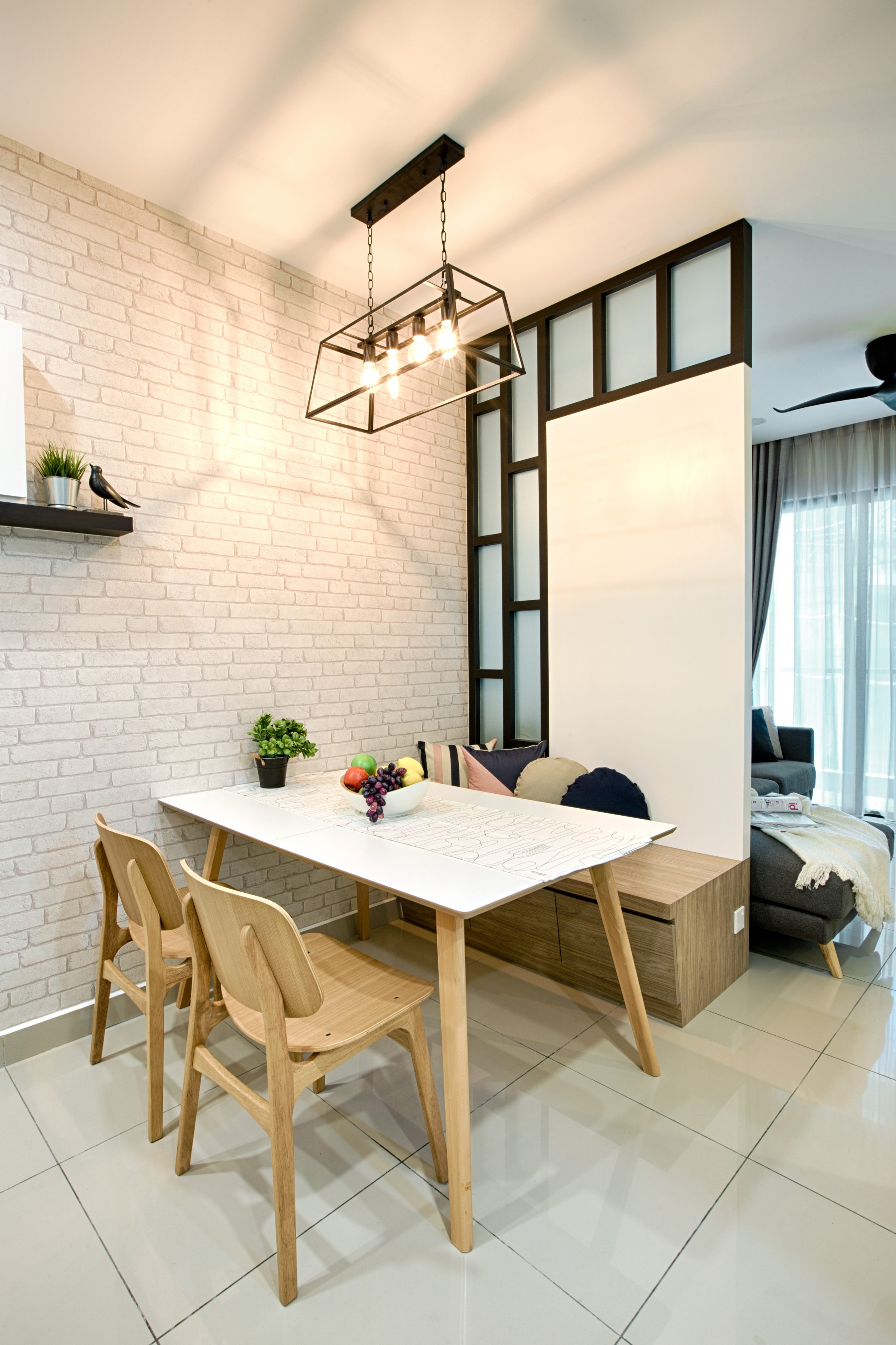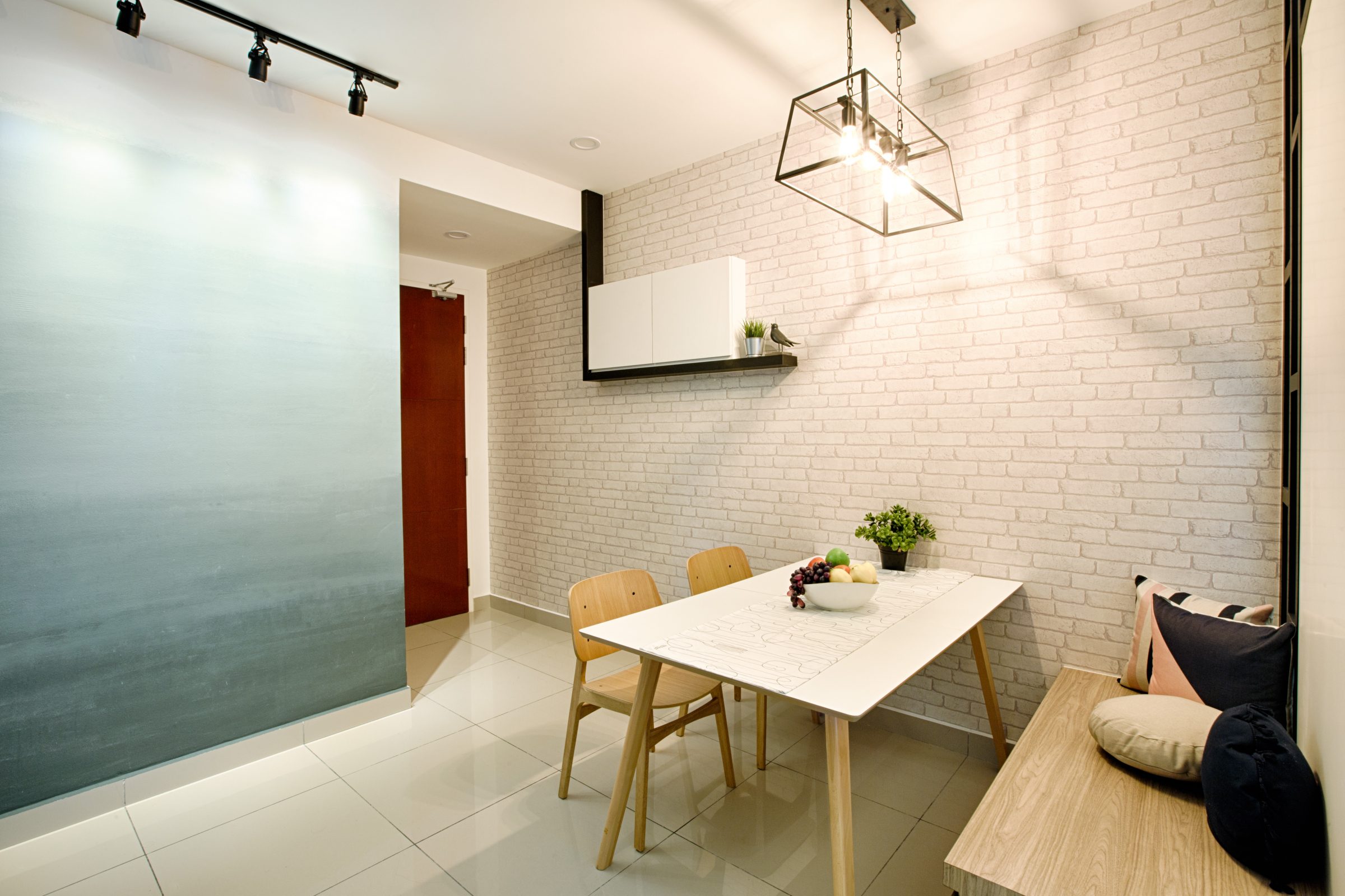 As demonstrated by GI Design with the pictured dining room, the pale background ties together the decorative elements and unobtrusively diverts the wandering gaze across an array of textures: whitewashed bricks on the wall, the lightly treated woodwork of the furniture, andthe sleek black frames.