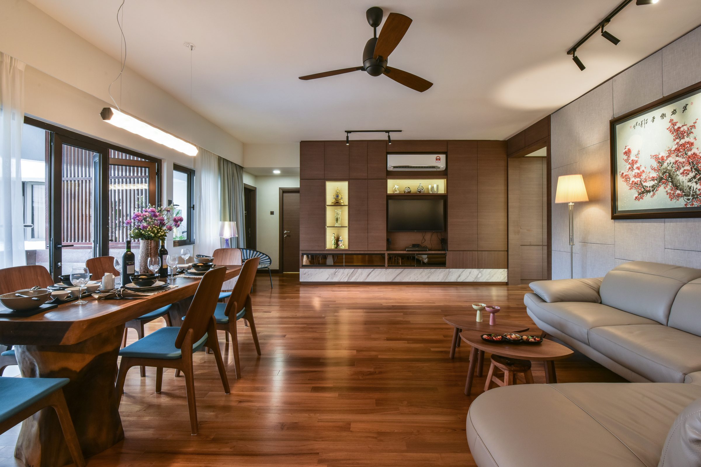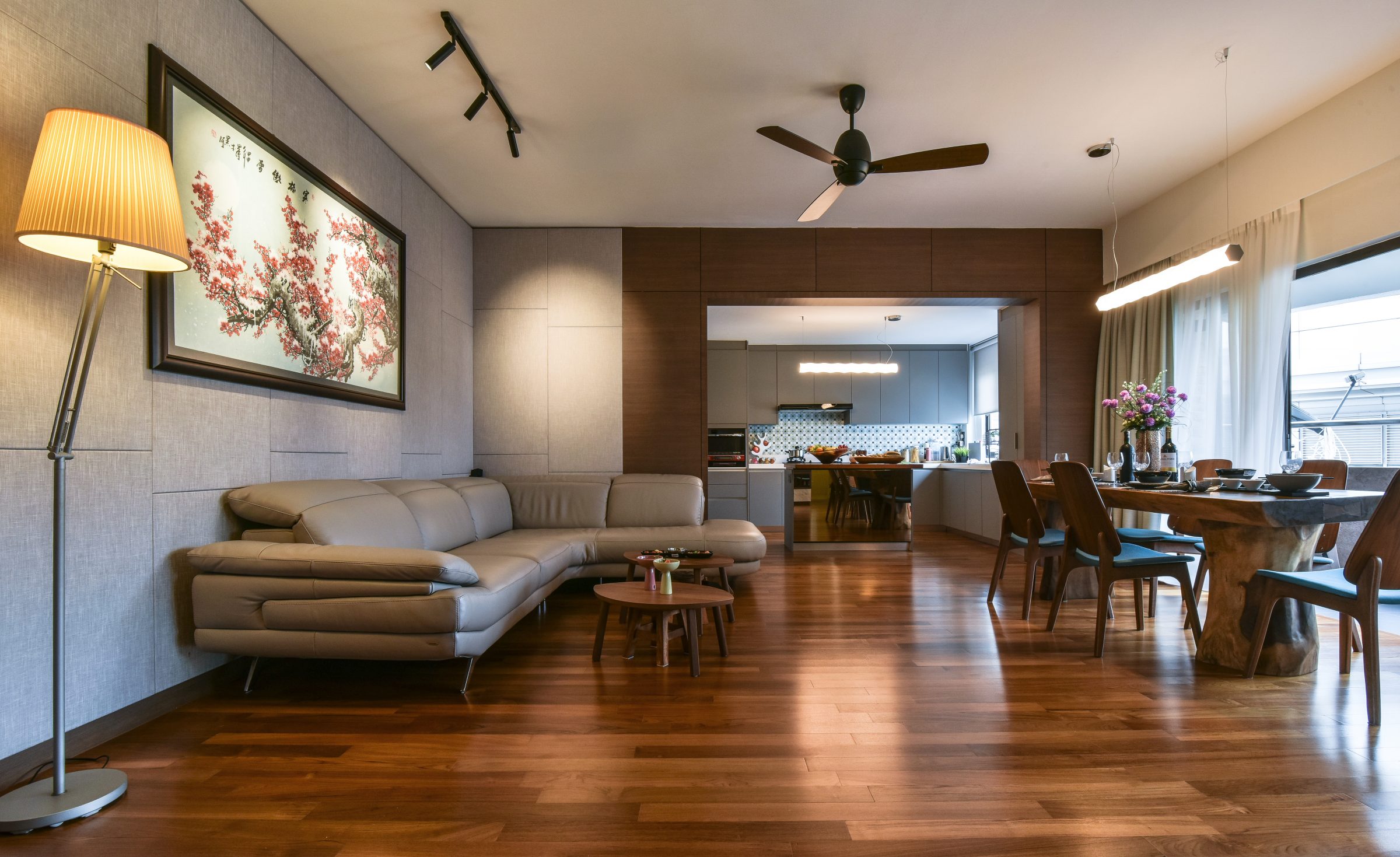 Ventilation is provided by the thoughtfully placed ceiling fans, and an uplifting sense of volume is created in the delectably lit ceiling tray, emblazoned with intriguing decorative details for the eye to linger upon.