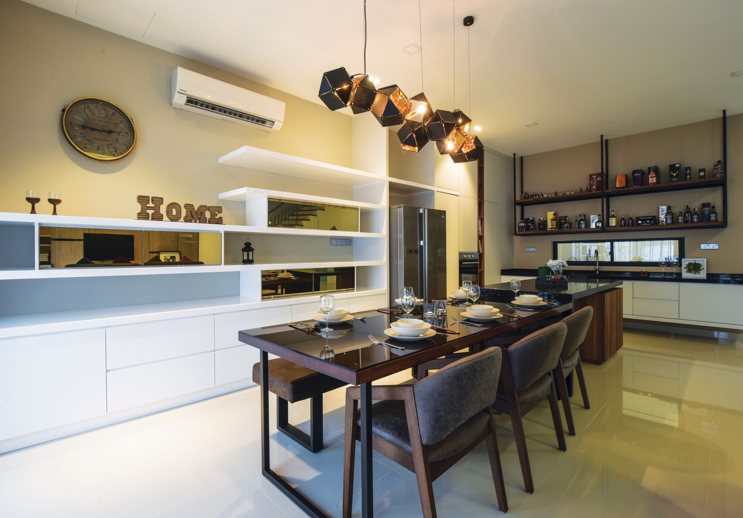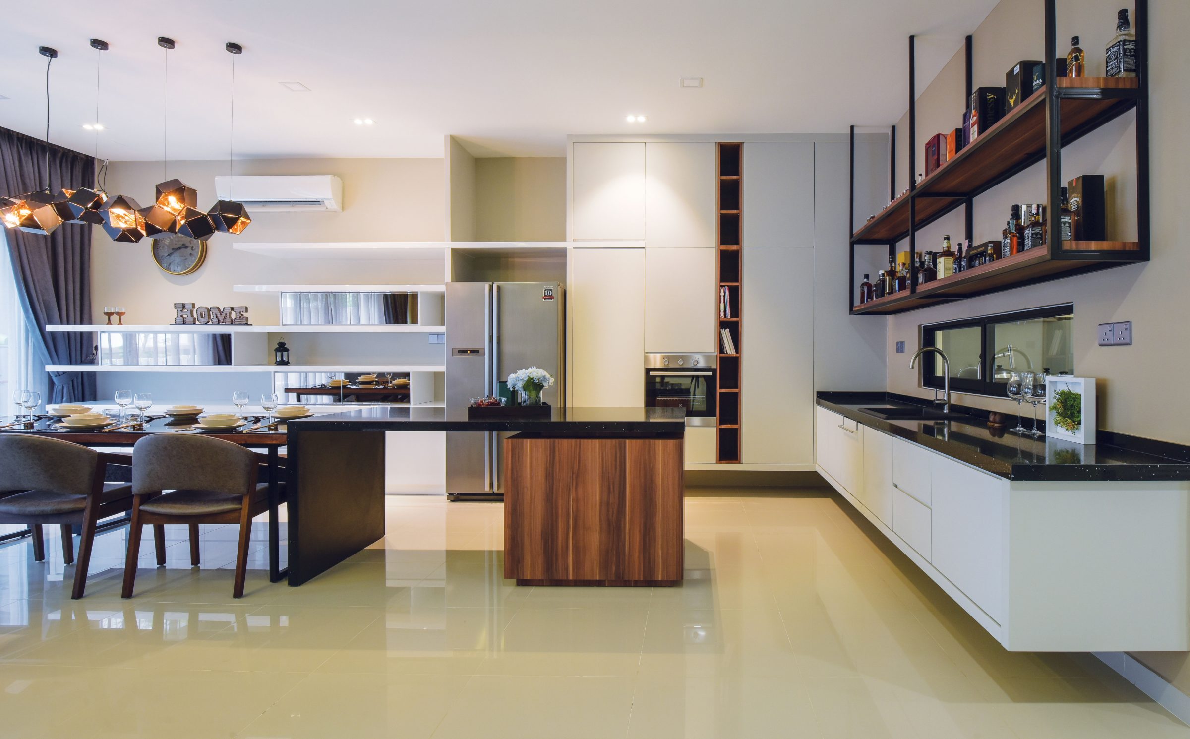 Just as the details of a mess have unintentional effects on a décor, disparate decorative elements can affect the ambiance in detrimental ways by pulling the message of the space in divergent directions. With furniture and material choices in tune with each other, Nu Infinity renders the pictured space cohesive with a colour scheme of black and pale wood tones against a white background. While the resulting décor is unified to make its appreciation easier for the naïve observer, the space is additionally drenched in warm lighting to produce a soothing ambiance.
