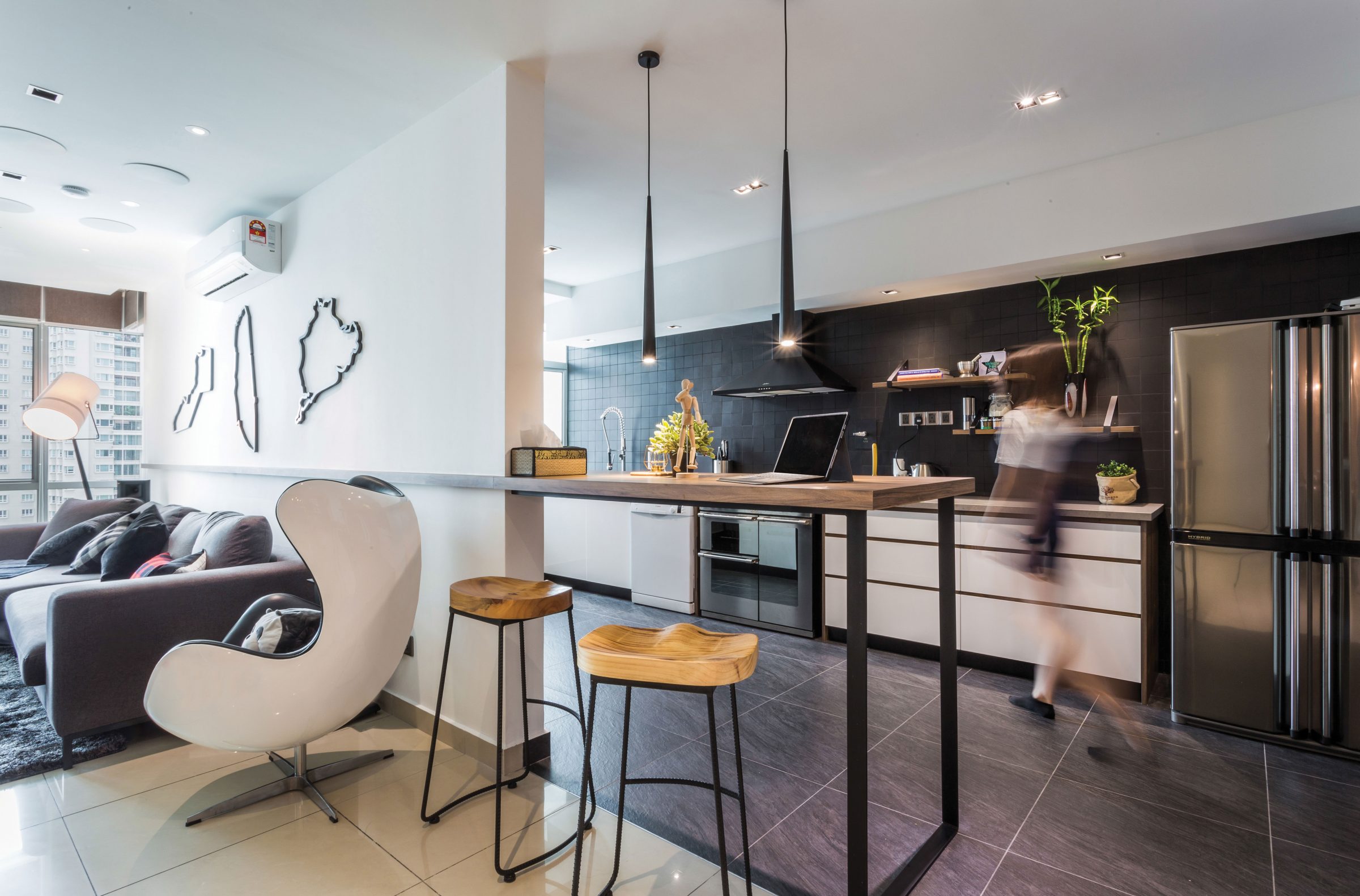 A wide island counter projects from the wall of the seating lounge, the minimalist design of the supporting legs and the accompanying bar stools maintaining a sense of air volume in the corridor to the kitchen. The default floor tiles seen in the rest of the open layout transition to textured grey stone in the kitchen, complementing the matte black square tiles on the walls while contrasting against the pale wood and white veneer of the cabinetry.